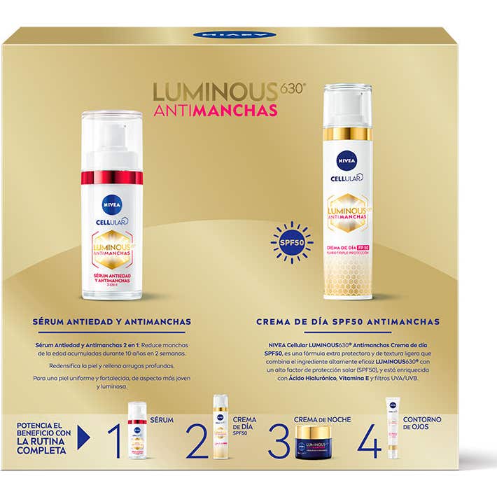 Nivea Tratamiento Antimanchas y Antiedad Pack Serum + Crema Día es una solución integral para el cuidado facial, que combina dos productos destacados de la gama Luminous630.