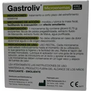 Normon Bensania Gastroliv Microenemas 6 uds son microenemas diseñados para proporcionar una acción local que facilita una evacuación suave. Estos microenemas son útiles para ayudar a aliviar el estreñimiento ocasional, cuidando al mismo tiempo la mucosa rectal.