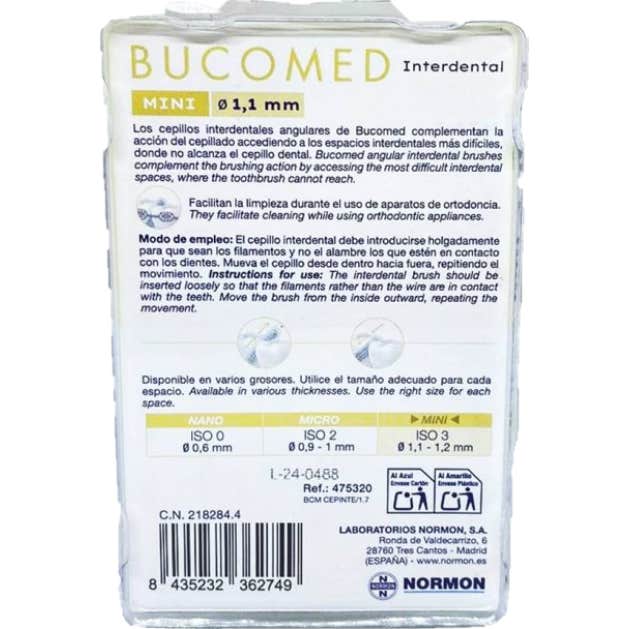 Normon Bucomed Interdental Mini Cepillo Extra Fino 1.1Mm 6 uds es una herramienta diseñada para la higiene bucal, especialmente en espacios interproximales. Este cepillo interdental es efectivo para eliminar el biofilm dental acumulado, ideal para quienes utilizan aparatos de ortodoncia, así como para el cuidado de implantes y prótesis fijas.