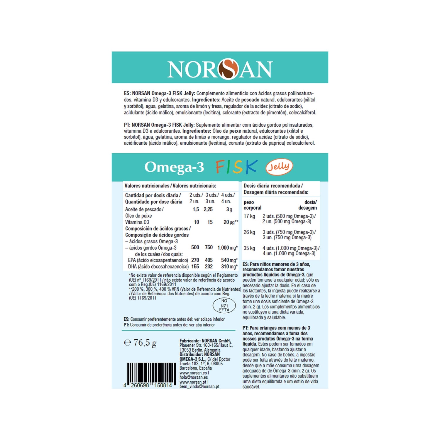 Aceite de pescado natural, edulcorantes (xilitol y sorbitol), agua, gelatina, aroma de limón y fresa, regulador de la acidez (citrato de sodio), acidulante (ácido málico), emulsionante (lecitina), colorante (extracto de pimentón), colecalciferol.