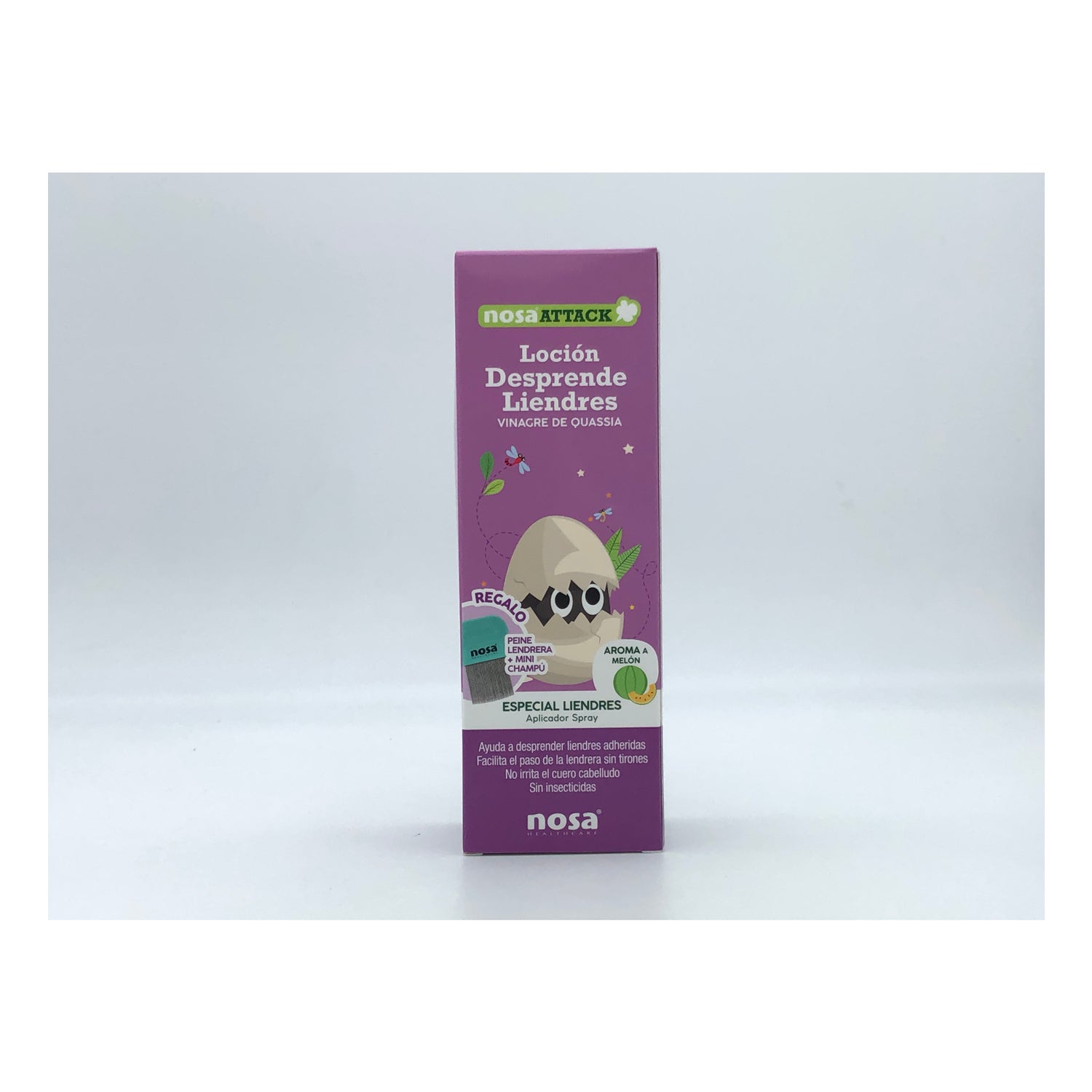 Nosa Loción Desprende liendres aroma Melón 150ml es una loción indicada para ayudar a desprender las liendres adheridas al cabello y peinarlo sin tirones. Formulada con vinagre y dimeticona.
