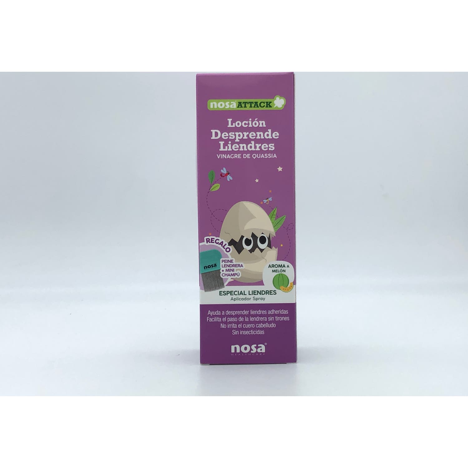 Nosa Loción Desprende liendres aroma Melón 150ml es una loción indicada para ayudar a desprender las liendres adheridas al cabello y peinarlo sin tirones. Formulada con vinagre y dimeticona.