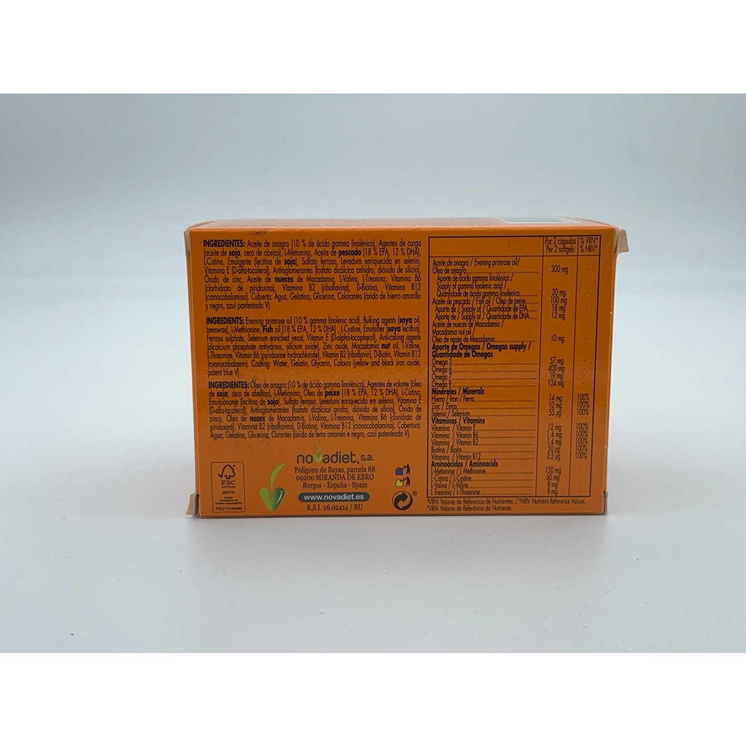 Onagra (10 % ácido gamma linolénico), Agentes de carga (aceite de soja, cera de abejas), L-Metionina, Aceite de pescado (18 % EPA, 12 % DHA), L-cistina, Emulsionante (lecitina de soja), sulfato ferroso, Selenio enriquecido levadura, Vitamina E (D-alfa-tocoferol), Antiaglomerantes (fosfato dicálcico anhidro, óxido de silicio), Óxido de zinc, Aceite de nuez de macadamia, L-Valina, L-Treonina, Vitamina B6 (clorhidrato de piridoxina), Vitamina B2 ( riboflavina), D-Biotina, Vitamina B12 (cianocobalamina).
