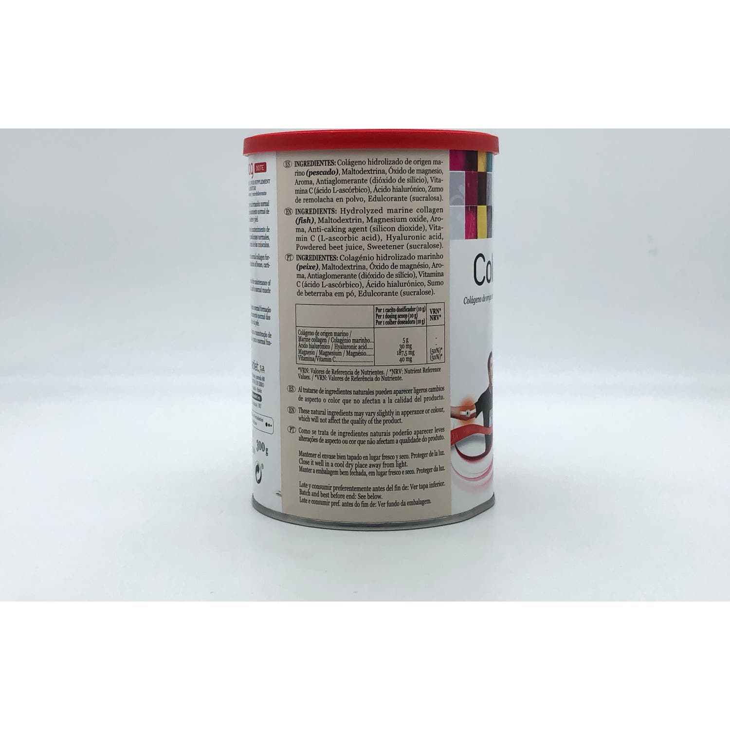 Colágeno hidrolizado de origen marino (pescado), Maltodextrina, Óxido de magnesio, Aroma, Antiaglomerante (dióxido de silicio), Vitamina C (ácido L-ascórbico), Ácido hialurónico, Zumo de remolacha en polvo, Edulcorante (sucralosa).