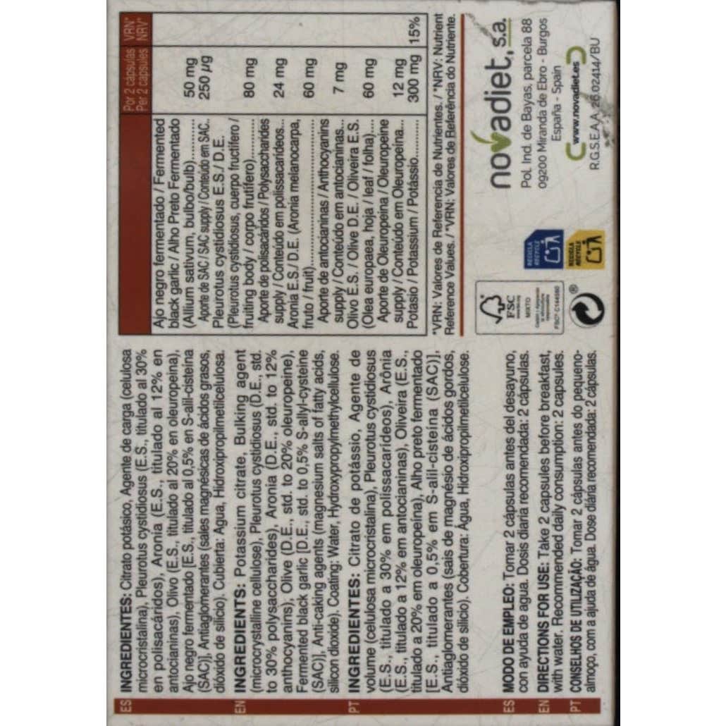 Citrato potásico, Ajo negro fermentado [E.S., titulado al 0,25% en S-alil-cisteína (SAC)], Pleurotus cystidiosus (E.S., titulado al 30% en polisacáridos), Agente de carga (celulosa microcristalina), Aronia (E.S., titulado al 12% en antocianinas), Olivo (E.S., titulado al 20% en oleuropeina), Antiaglomerantes (estearato de magnesio, dióxido de silicio). Cubierta: Agua, Hidroxipropilmetilcelulosa.