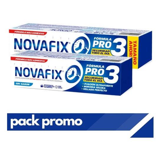 Novafix Pro3 Sin Sabor Crema Adhesiva 70g + 50g es una pasta dental qeu contribuye a mejorar la fijación de la dentadura postiza en el paladar. Ofrece una sujeción ultrafuerte de hasta 24 horas de duración.