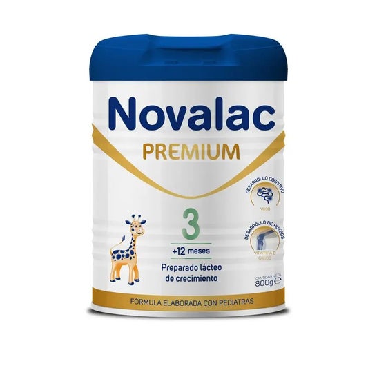 Novalac Premium 3 +12m 800g es una leche aporta la mitad de la dosis diaria recomendada de Hierro, el 100% de la cantidad diaria recomendada de Vitamina D y de Calcio.