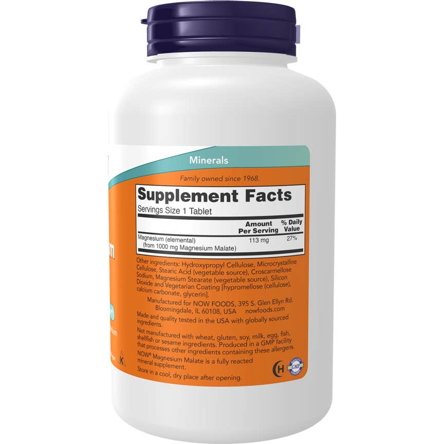 Now Magnesium Malate 1000mg 180comp es un suplemento que combina magnesio quelado con ácido málico. Este producto ofrece una dosis de 1000 mg de magnesio por porción, lo que puede contribuir al bienestar general del organismo.