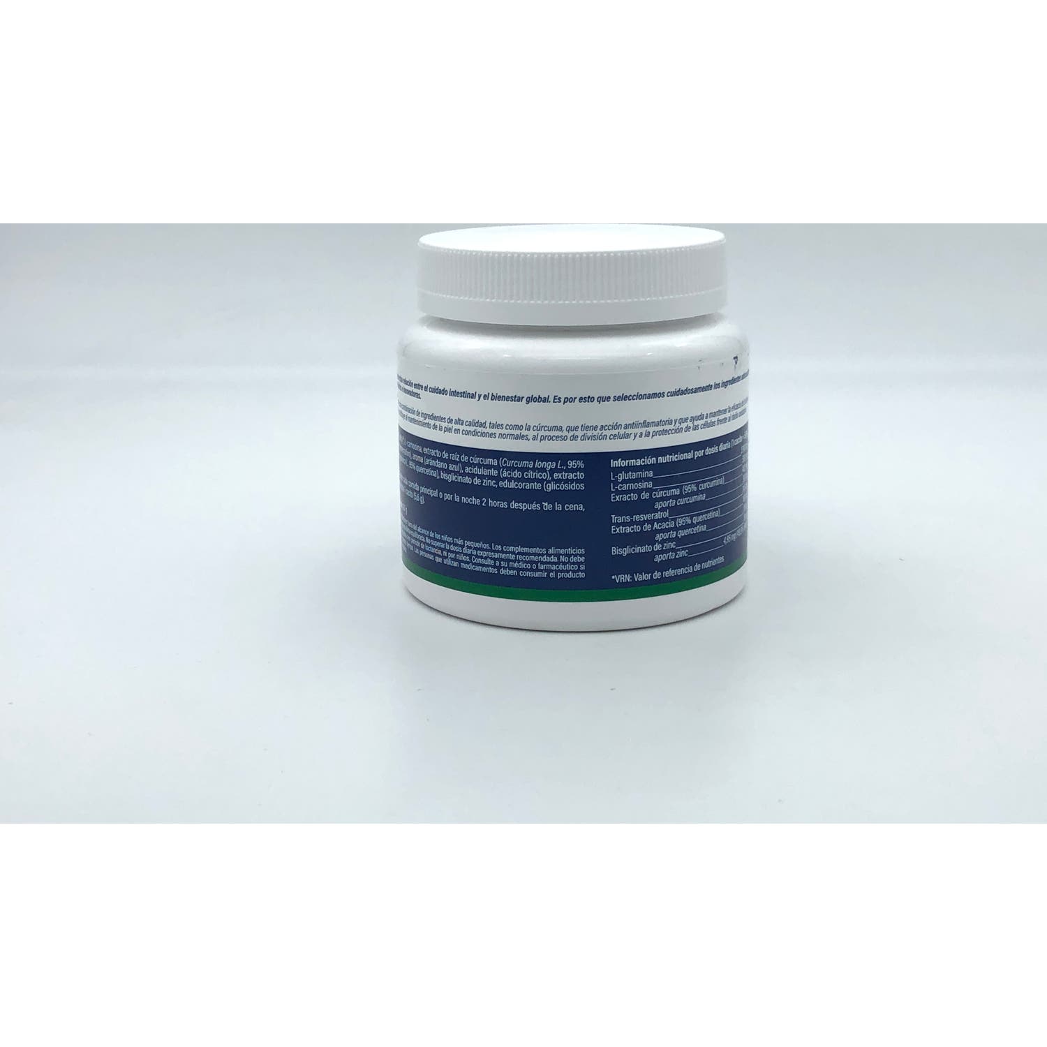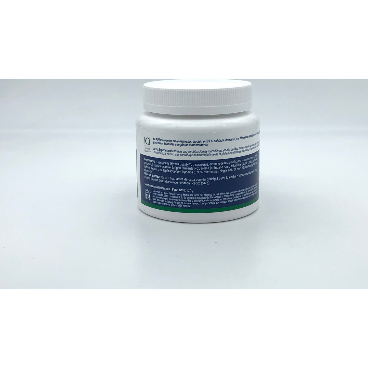Por dosis diaria: L-Glutamina KYOWA 3.900mg, L-Carnosina 503mg, Curcumina E.S. 95% 402mg, Bisglicinato de zinc 15mg, Quercetina (Acacia Japón E.S. 95%) 75mg, Resveratrol E.S. 25% 251mg, Ácido cítrico 167mg, Stevia 17mg, Dióxido de silicio 33mg.