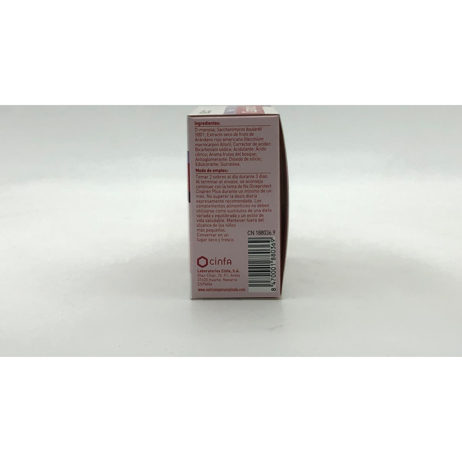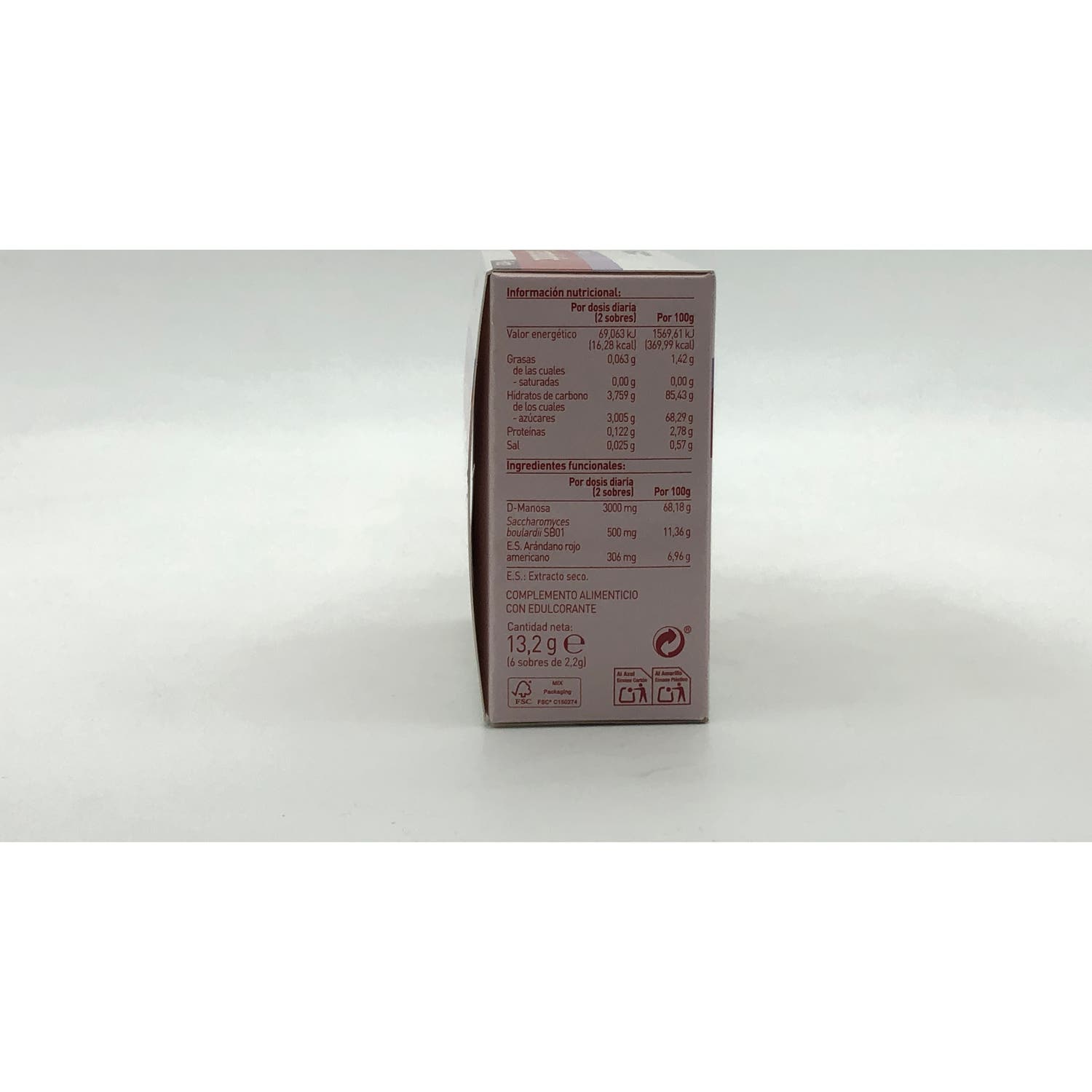 D-manosa; Saccharomyces boulardii SB01; Extracto seco de fruto de arándano rojo americano (Vaccinium macrocarpon Aiton); Corrector de acidez: Bicarbonato sódico; Acidulante: Ácido cítrico; Aroma frutos del bosque; Antiaglomerante: Dióxido de silicio; Edulcorante: Sucralosa.