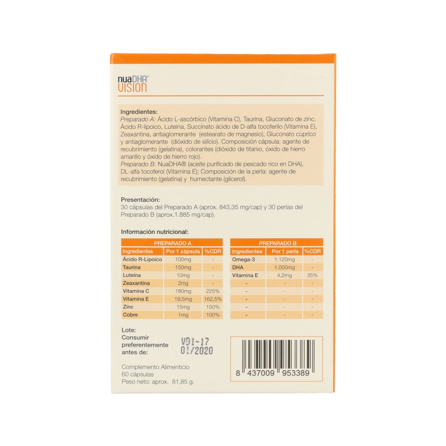 NuaDHA Vision 30caps + 30 perlas es un complemento alimenticio con todos los nutrientes esenciales para ayudar a conservar en buen estado la visión gracias a sus efectos sobre la retina, la córnea y el cristalino.