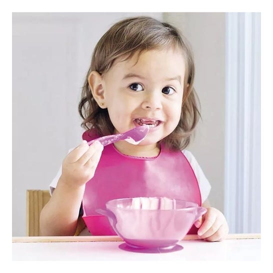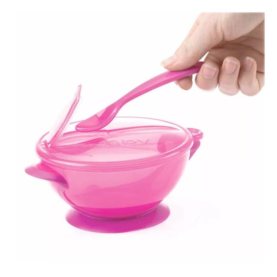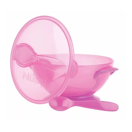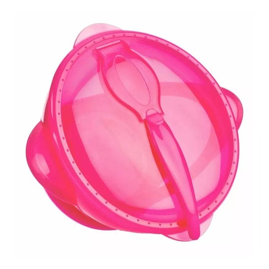 Recipiente en forma de bol elaborado a base de tritán y silicona que facilita el guardado y transporte de los alimentos. Indicado para el uso infantil, dispone de una ventosa de fijación y cuenta con una cuchara. Su tapa ofrece un sellado hermético y se puede introducir en el microondas con la finalidad de calentar los víveres. Color rosa.