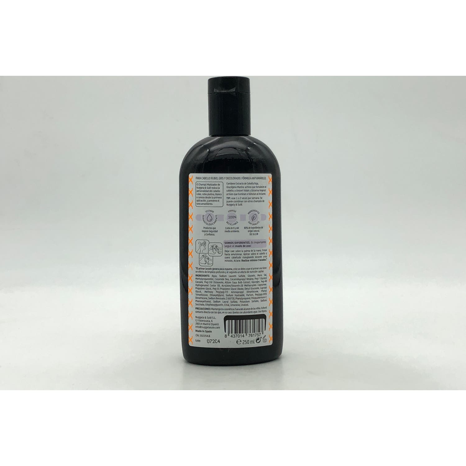 Nuggela & Sulé Champú Matizador Rubios y Grises 250ml es un champú que cuenta con ingredientes activos que ayudan a disminuir los reflejos amarillentos del cabello. Estimula el fortalecimiento natural de las fibras capilares. No deja manchas después de su uso. La consistencia cremosa permite una aplicación sencilla y rápida. Se absorbe rápidamente en el cuero cabelludo para optimizar sus efectos a largo plazo.