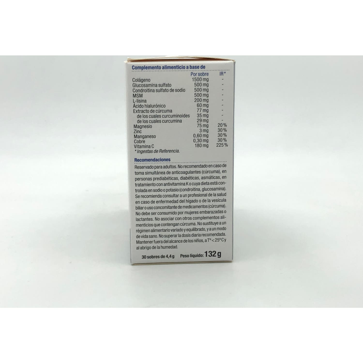 Complemento alimenticio a base de colágeno hidrolizado, condroitina, glucosamina y extracto de cúrcuma. Favorece el funcionamiento normal del sistema articular y ayuda a mantener la piel en condiciones normales.