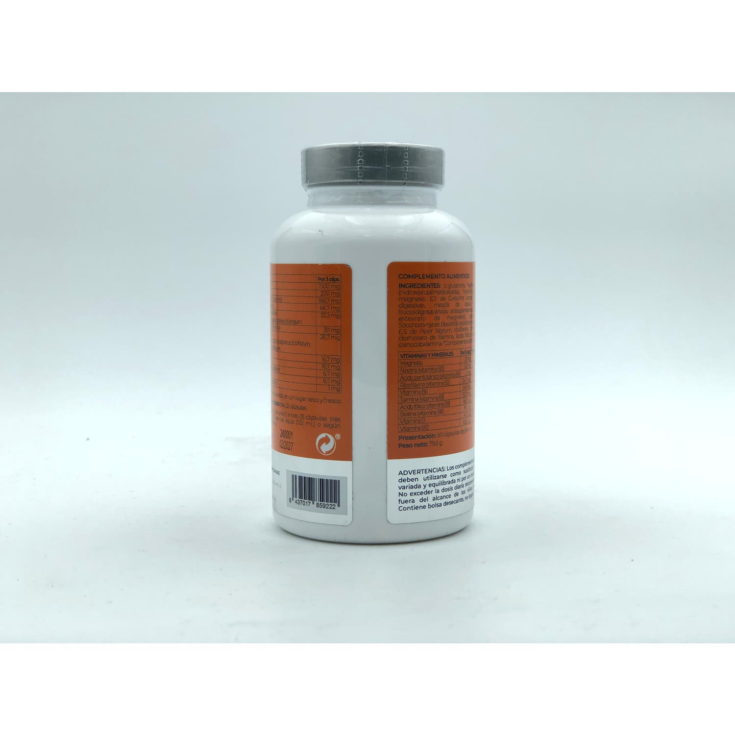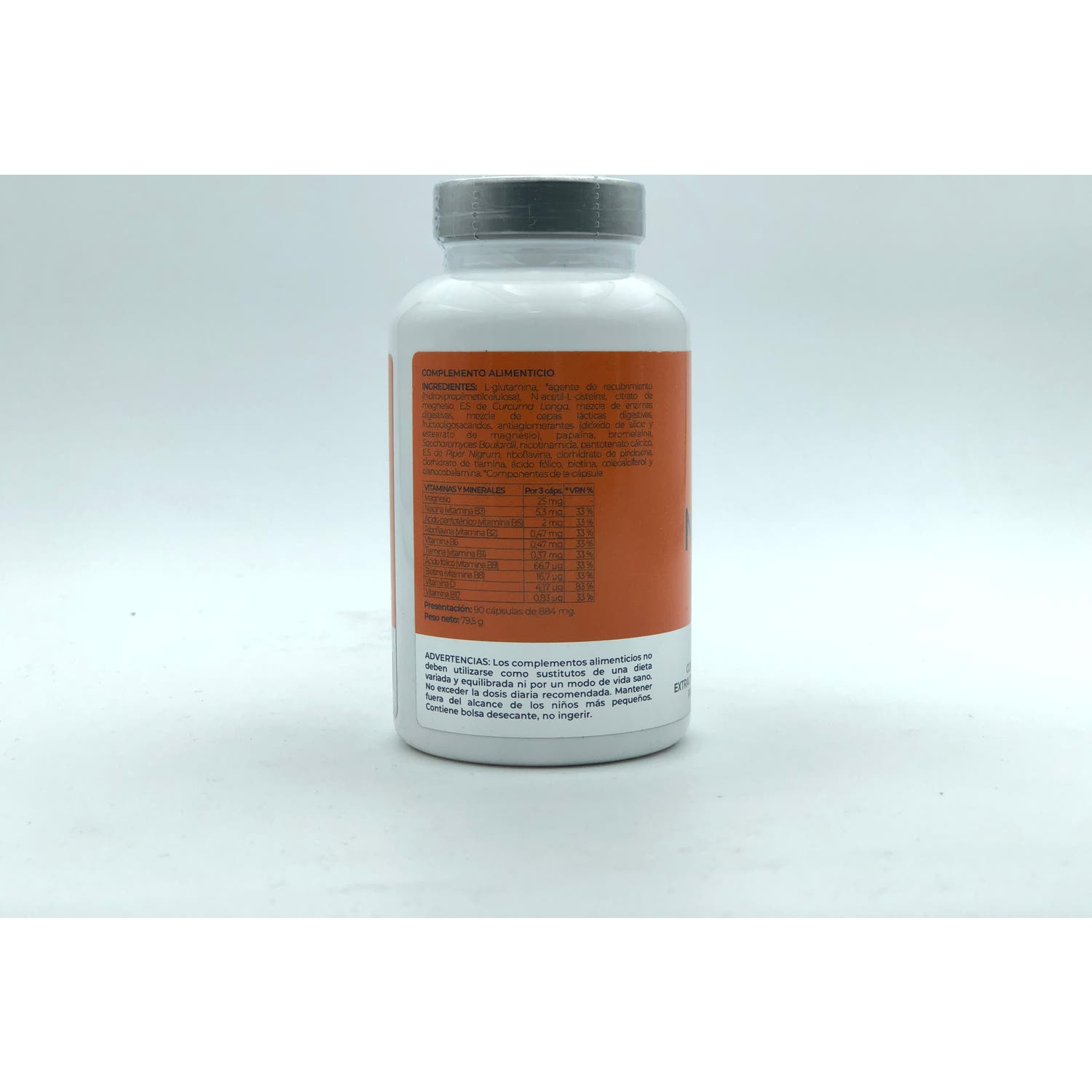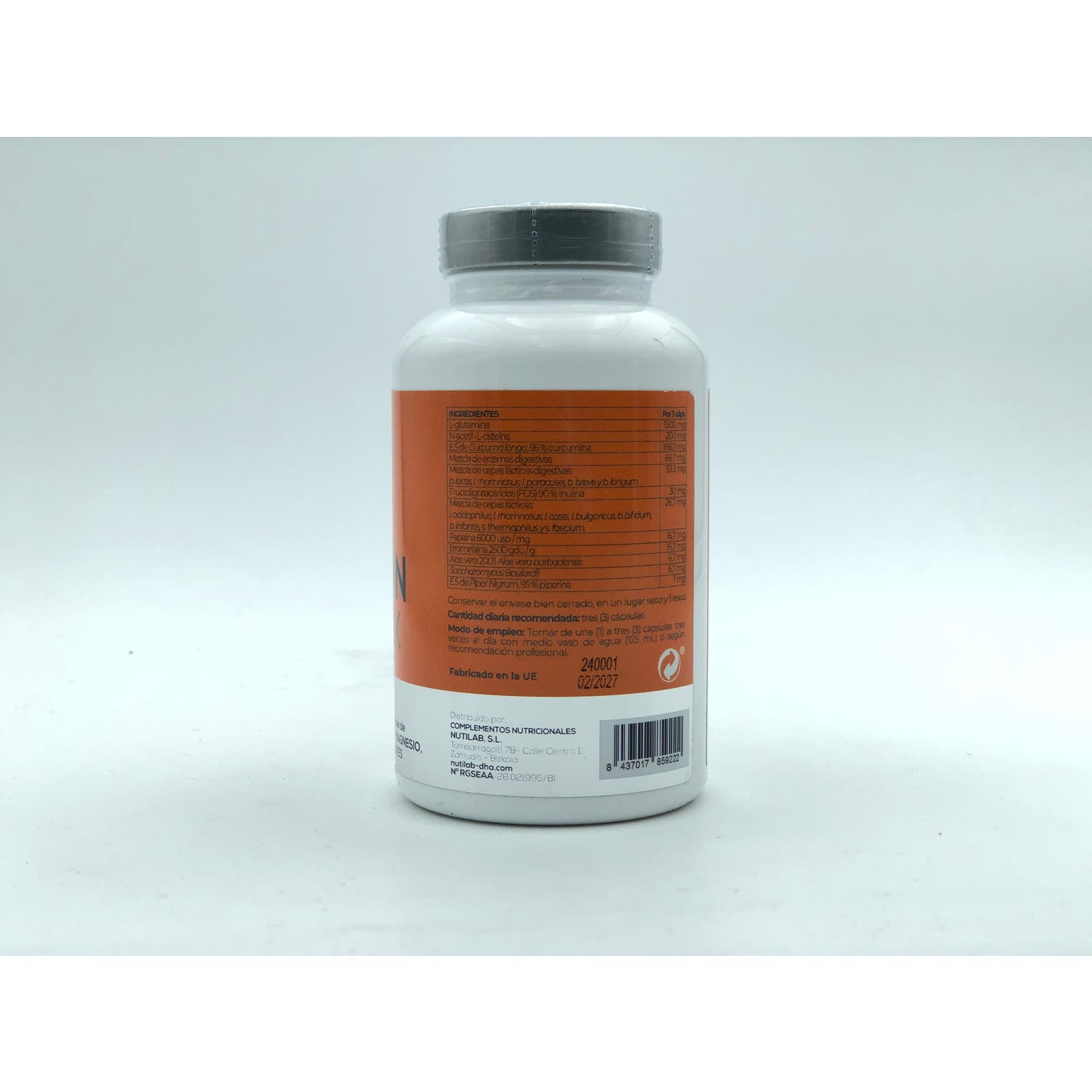 L-glutamina (4500 mg), N-acetil L-cisteína (600 mg), Extracto seco de cúrcuma (95 % curcumina Curcuma longa)(500 mg), Mezcla enzimas digestivas (200 mg)(Amilasa 3,250 DU (85 mg), Proteasa 4.5 12,000 HUT (85 mg), Glucoamilasa 4.5 AGU (85 mg), Invertasa 50 SU (85 mg), Lipasa 200 FIP (85 mg), α-galactosidasa 30 GalU (85 mg), Celulasa 200 CU (85 mg), Lactasa ALU (85 mg)), Mezcla de cepas lácticas digestivas (100 mg)(Bifidobacterium lactis, Lactobacillus rhamnosus, Lactobacillus paracasei, Bifidobacterium breve, Bifidobacterium longum), Fructooligosacárido (FOS)(90 mg), Mezcla de cepas lácticas (80 mg)(Lactobacillus acidophilus, Lactobacillus rhamnosus, Lactobacillus casei, Lactobacillus bulgaricus, Bifidobacterium bifidum, Bifidobacterium infantis, Streptococcus thermophilus, Streptococcus faecium), Papaína (50 mg), Bromelaína (50 mg), Jugo aloe (20 mg), Saccharomyces boulardii (20 mg)(aportando 400 millones UFC), Extracto seco de pimienta negra (95% piperina Piper nigrum)(3 mg), Magnesio (75 mg), Niacina (vitamina B3)(16 mg), Ácido pantoténico (vitamina B5)(6 mg), Riboflavina (vitamina B2)(1,4 mg), Vitamina B6 (piridoxina)(1,4 mg), Tiamina (vitamina B1)(1,1 mg), Ácido fólico (Vitamina B9)(200 mcg), Biotina (vitamina B8)(50 mcg), Vitamina D3 (colecalciferol)(12,5 mcg), Vitamina B12 (cobalamina)(2,5 mcg). Contenido de 9 cápsulas.