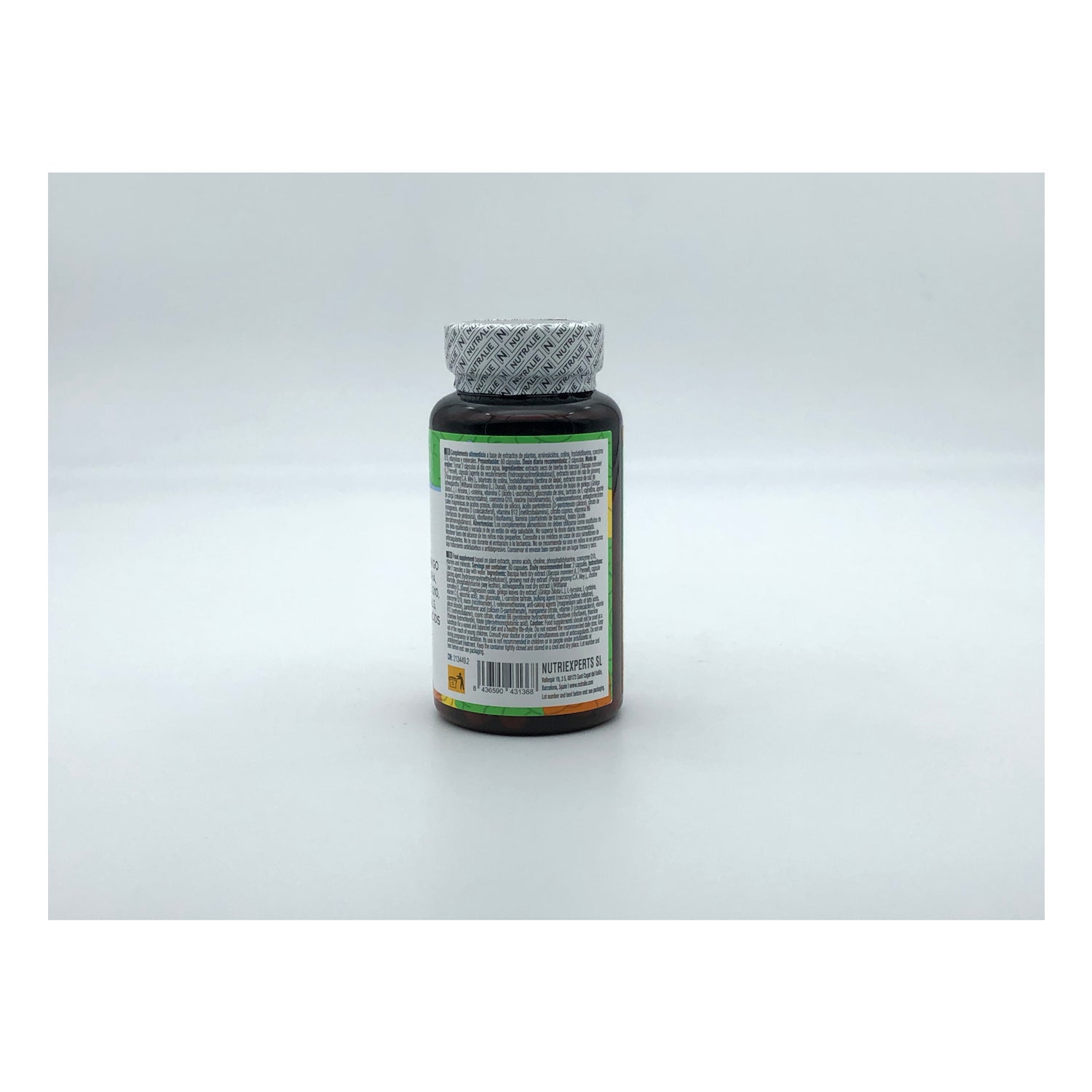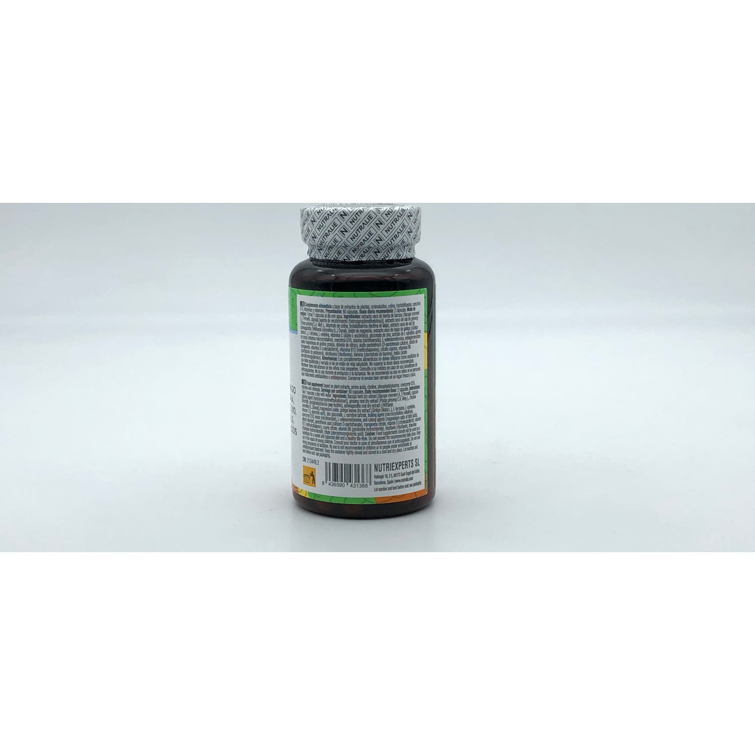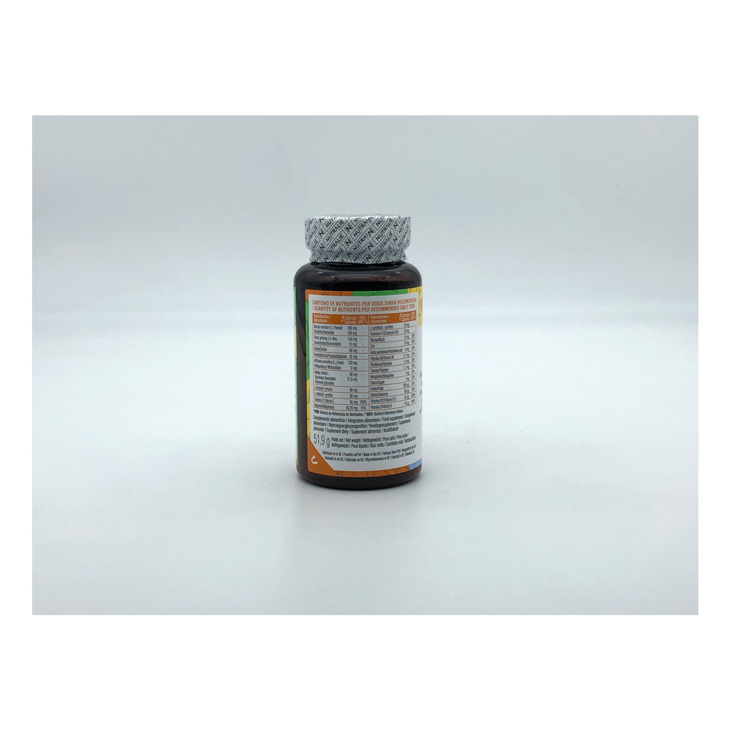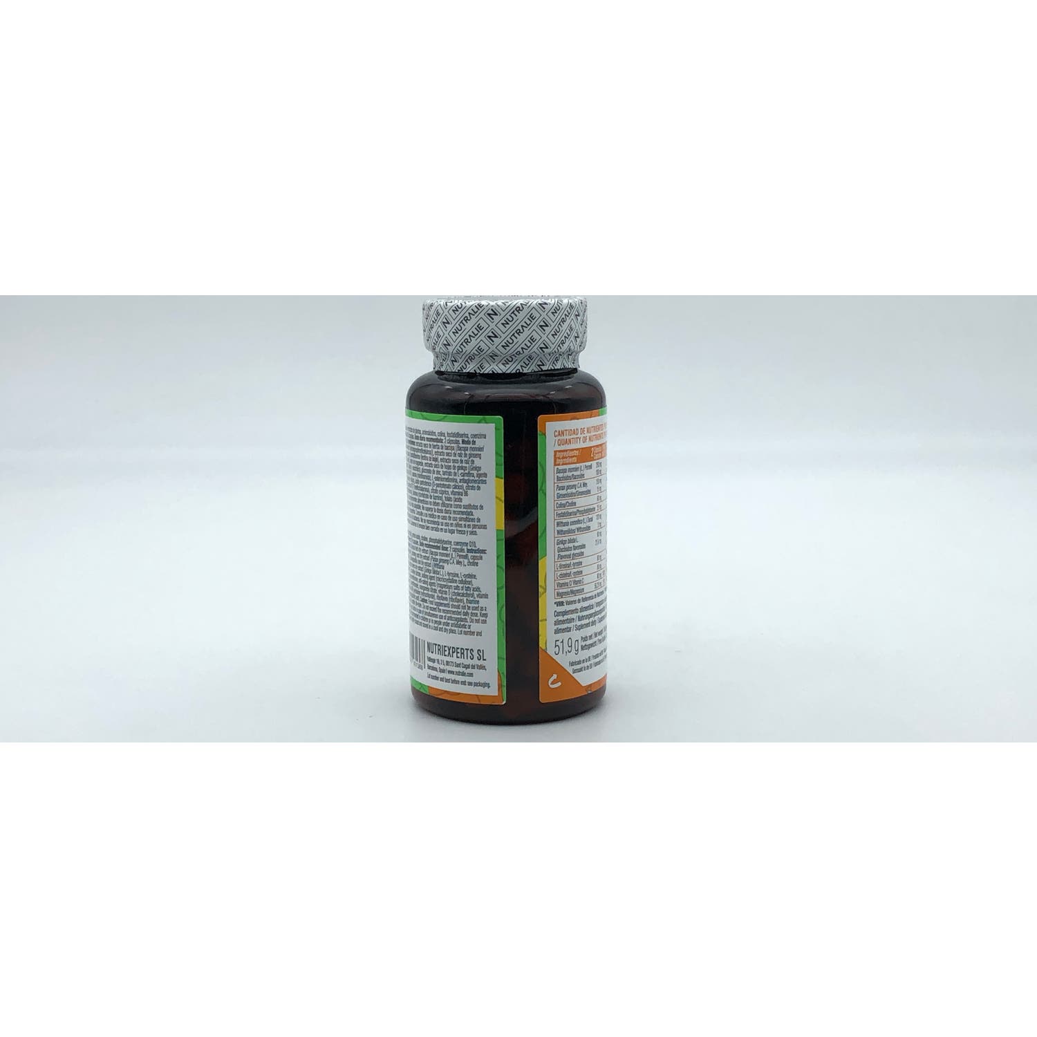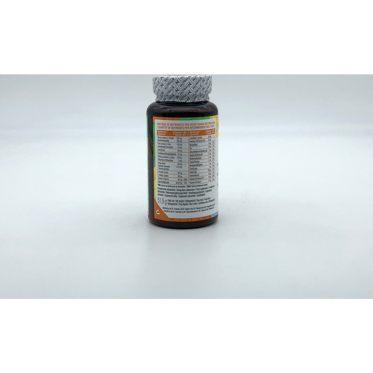 extracto seco de hierba de bacopa (Bacopa monnieri (L.) Pennell), cápsula [agente de recubrimiento (hidroxipropilmetilcelulosa)], extracto seco de raíz de ginseng (Panax ginseng C.A. Mey.), bitartrato de colina, fosfatidilserina (lecitina de soja), extracto seco de raíz de ashwagandha (Withania somnifera (L.) Dunal), óxido de magnesio, extracto seco de hojas de ginkgo (Ginkgo biloba L.), L-tirosina, L-cisteína, vitamina C (ácido L-ascórbico), gluconato de zinc, tartrato de L-carnitina, agente de carga (celulosa microcristalina), coenzima Q10, niacina (nicotinamida), L-seleniometionina, antiaglomerantes (sales magnésicas de ácidos grasos, dióxido de silicio), ácido pantoténico (D-pantotenato cálcico), citrato de manganeso, vitamina D (colecalciferol), vitamina B12 (metilcobalamina), citrato cúprico, vitamina B6 (clorhidrato de piridoxina), riboflavina (riboflavina), tiamina (clorhidrato de tiamina), folato (ácido pteroilmonoglutámico)