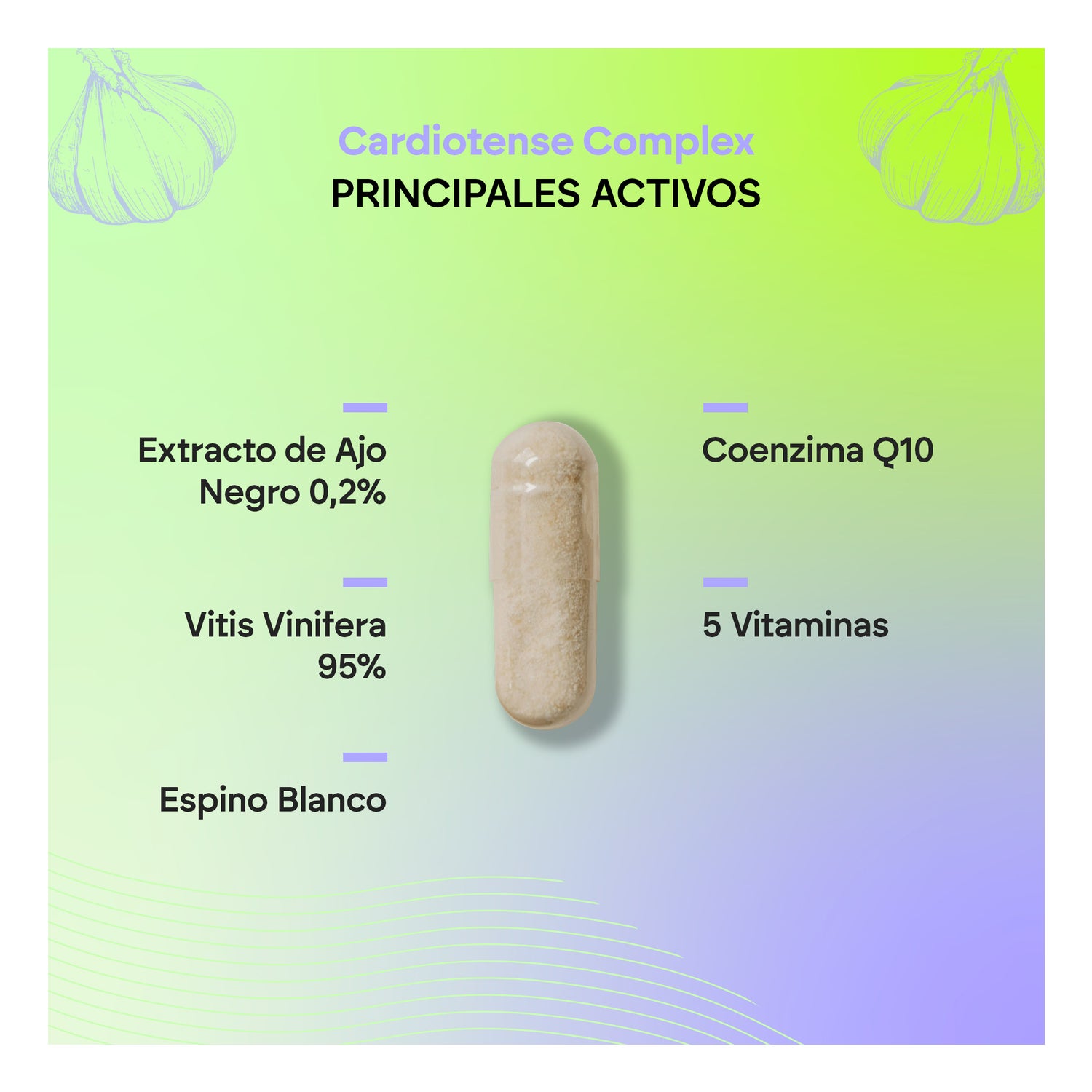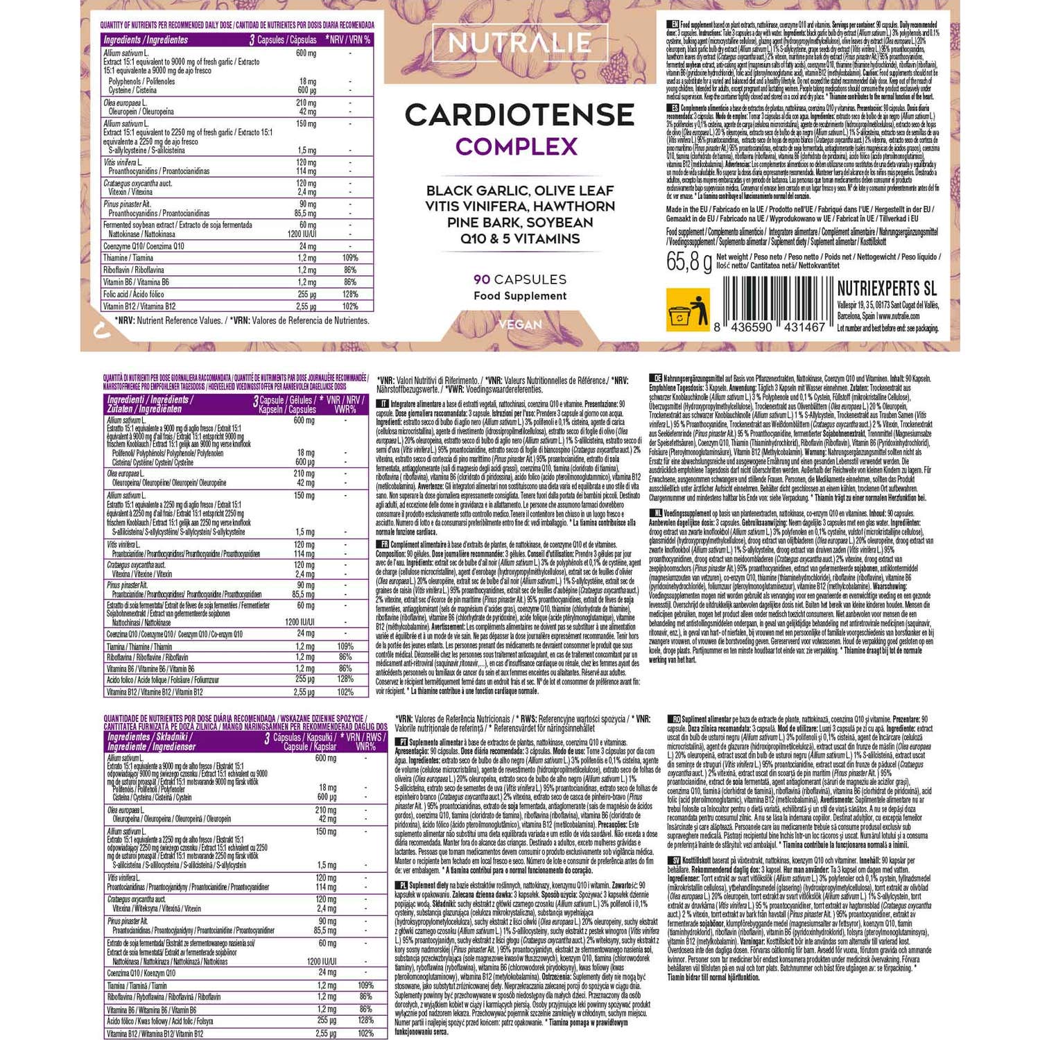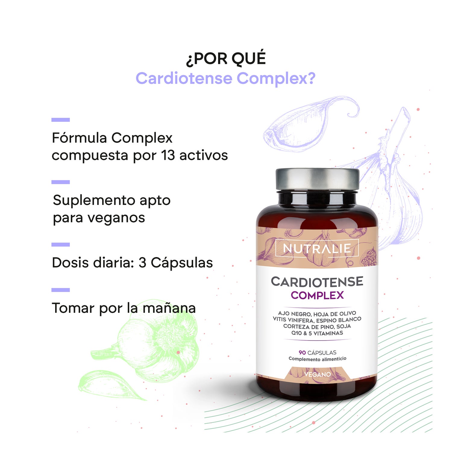 Cardiotense Complex de Nutralie es un complemento alimenticio formulado con 750mg de extracto puro de Ajo Negro (15:1) por dosis, equivalente a 15.000mg de Ajo Negro. Nuestra fórmula incluye Vitaminas B6 y B12, que contribuyen a la formación normal de glóbulos rojos, contribuyen al metabolismo normal de la homocisteína y, también contribuye al funcionamiento normal del sistema inmunitario. Por otro lado, la Vitamina B2, contribuye al mantenimiento normal de los glóbulos rojos en condiciones normales y también contribuye a la protección de las células frente al daño oxidativo.