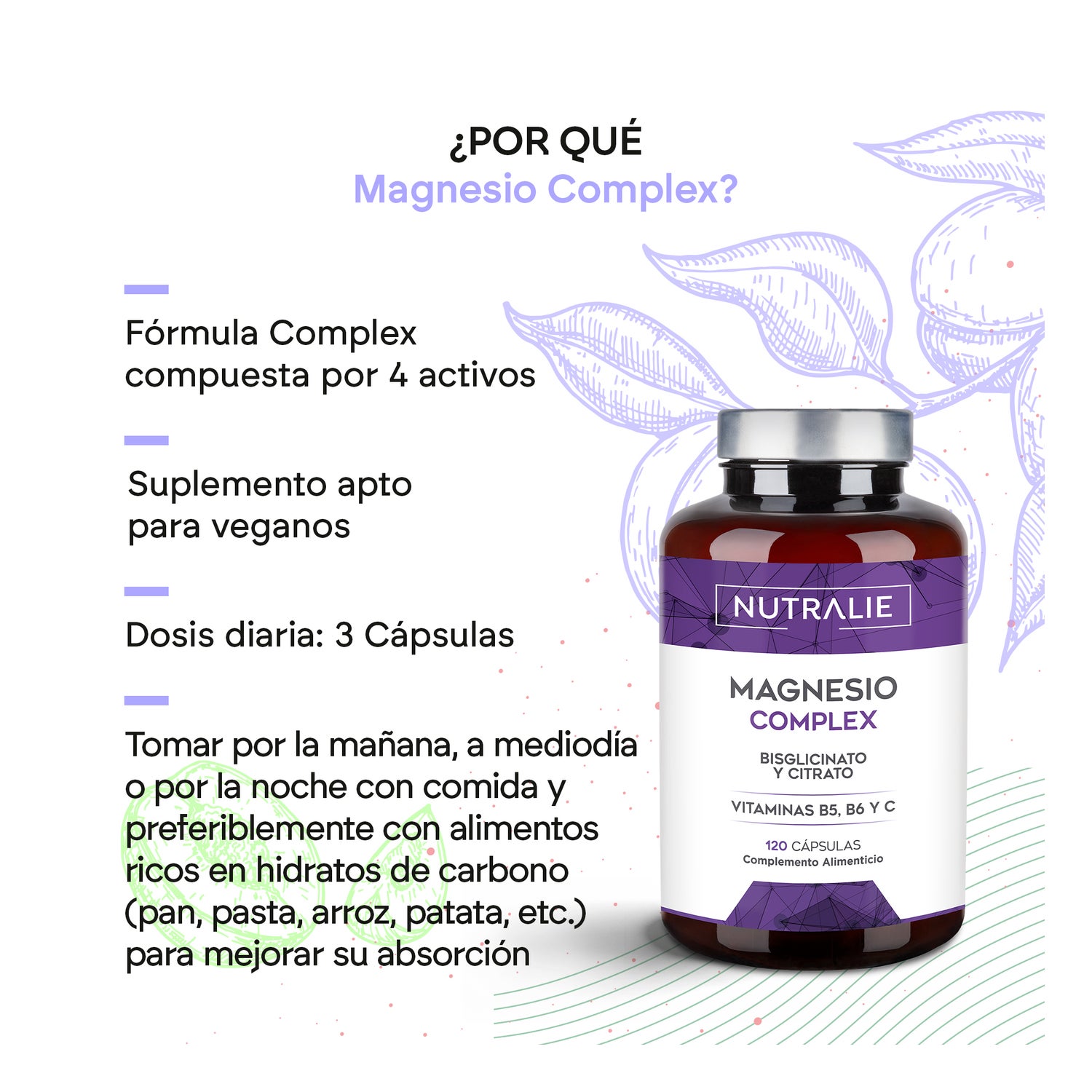 Nutralie Magnesio Complex + Bisglicinato y Citrato 120caps es un complemento alimenticio formulado con bisglicinato y citrato de magnesio enriquecido con vitaminas del grupo B.