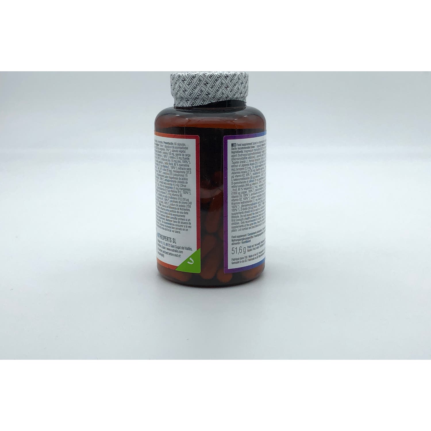 hidróxido de magnesio (56,25 mg magnesio, 15%*), cápsula vegetal: agente de recubrimiento (hidroxipropilmetilcelulosa), N-acetil-L-cisteína 100 mg, agente de carga (celulosa microcristalina), ácido L-ascórbico (80 mg vitamina C, 100%*), luteína 2,5 mg (fuente: Tagetes erecta L.), fumarato ferroso (14 mg hierro, 100%*), citrato de zinc (10 mg zinc, 100%*), extracto seco de Acacia del Japón (25,51 mg Sophora japonica L., botón floral, 95 % quercetina 25 mg), licopeno 2,5 mg, acetato de DL-alfa-tocoferilo (12 mg vitamina E, 100%*), extracto seco de Acacia del Japón (21,05 mg Sophora japonica L., flor, 95 % rutina 20 mg), menaquinona (37,5 μg vitamina K2, 50%*), nicotinamida (16 mg niacina, 100%*), coenzima Q10 (ubiquinona) 15 mg, L-seleniometionina (55 μg selenio, 100%*), antiaglomerante (sales magnésicas de ácidos grasos), D-pantotenato cálcico (6 mg ácido pantoténico, 100%*), antiaglomerante (dióxido de silicio), acetato de retinilo (800 μg vitamina A, 100%*), extracto seco naranjo 4,5 mg (Citrus sinensis (L.) Osbeck , fruto, 60 % hesperidina 2,7 mg), citrato de manganeso (1 mg manganeso, 50%*), citrato cúprico (1000 μg cobre, 100%*), cianocobalamina (2,5 μg vitamina B12, 100%*), colecalciferol (5 μg vitamina D3, 100%*), clorhidrato de piridoxina (1,4 mg vitamina B6, 100%*), riboflavina (1,4 mg vitamina B2, 100%*), molibdato de sodio [molibdeno (VI)] (50 μg molibdeno 100%*), clorhidrato de tiamina (1,1 mg vitamina B1, 100%*), picolinato de cromo (40 μg cromo, 100%*), ácido pteroilmonoglutámico (200 μg folato, 100%*), yoduro de potasio (150 μg yodo, 100%*), D-biotina (50 μg biotina, 100%*)