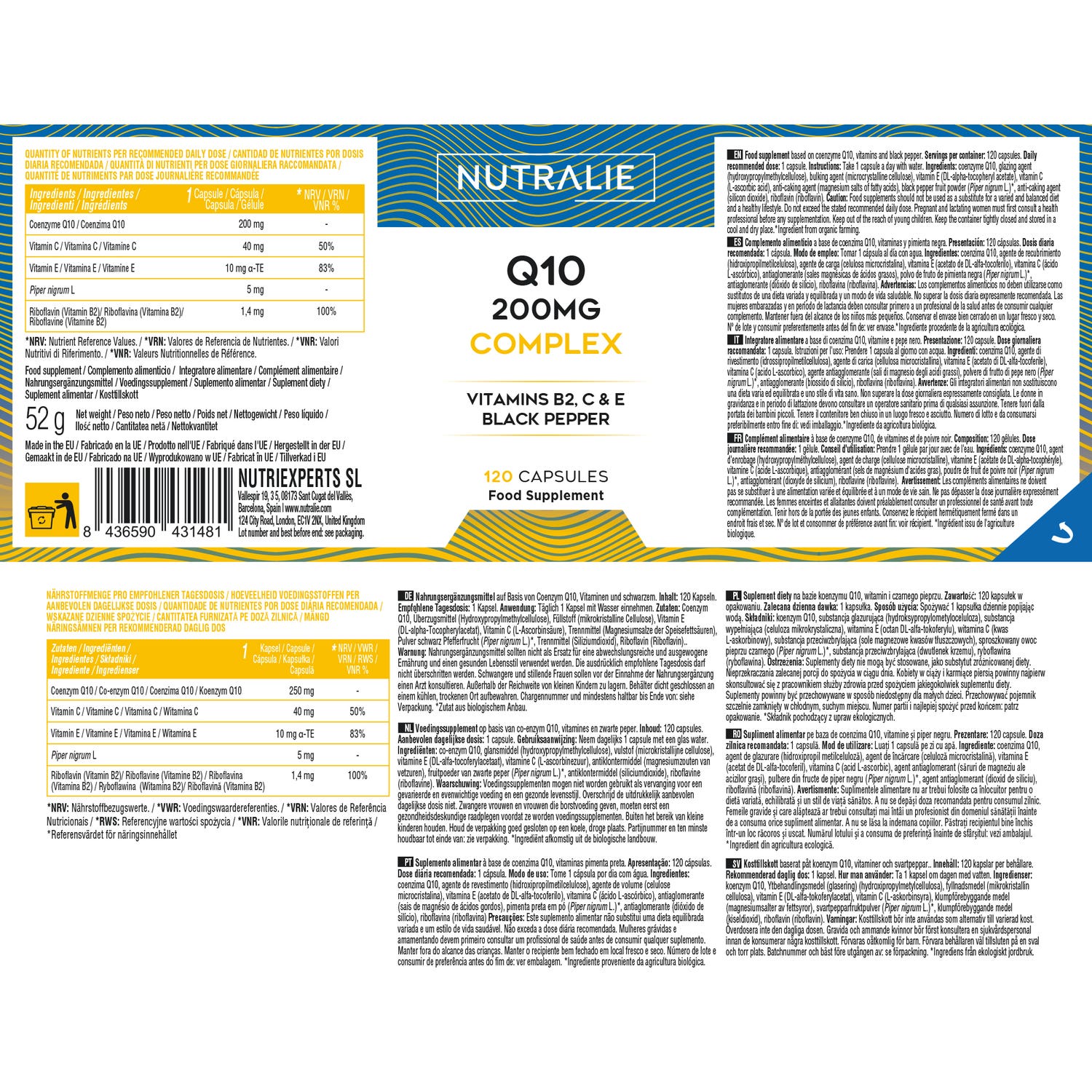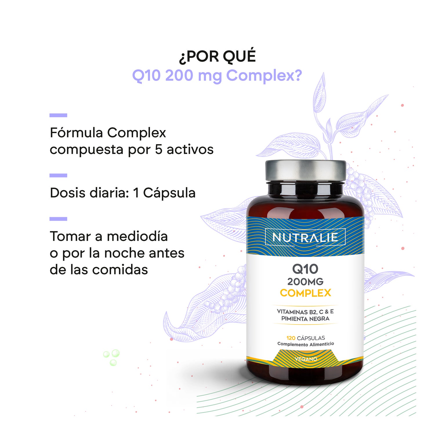 La Coenzima Q10 Complex de Nutralie es un suplemento alimenticio formulado con 200mg de Q10 y 50mg de Vitamina C, E y B2. La Q10 es un potente antioxidante, que junto con la Vitamina C, E y B2, contribuye a la protección de las células frente al daño oxidativo, convirtiéndolo en un potente suplemento que ayuda la prevención del daño que los radicales libres causan a las células. Así mismo, la Vitamina C y B2 presentes en nuestra fórmula también ayudan a disminuir el cansancio y la fatiga y, la Vitamina C contribuye al funcionamiento normal del sistema inmunitario.