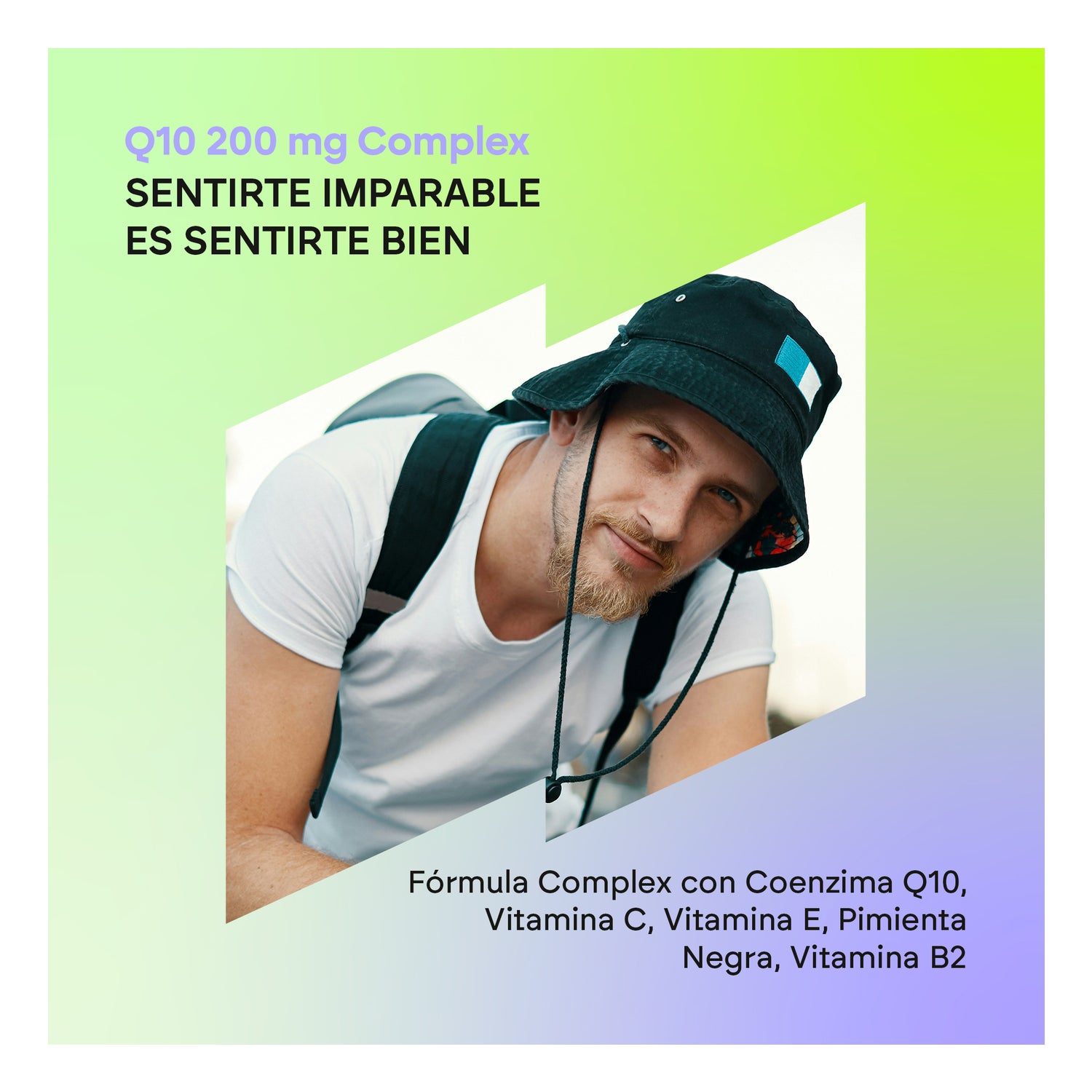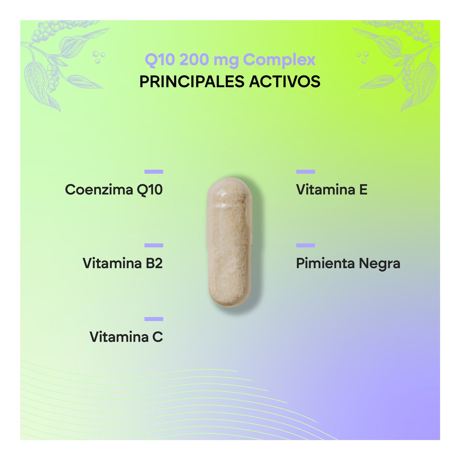 Coenzima Q10, agente de recubrimiento (hidroxipropilmetilcelulosa), agente de carga (celulosa microcristalina), vitamina E (acetato de DL-alfa-tocoferilo), vitamina C (ácido L-ascórbico), antiaglomerante (sales magnésicas de ácidos grasos), polvo de fruto de pimienta negra (Piper nigrum L.)*, antiaglomerante (dióxido de silicio), riboflavina (riboflavina).