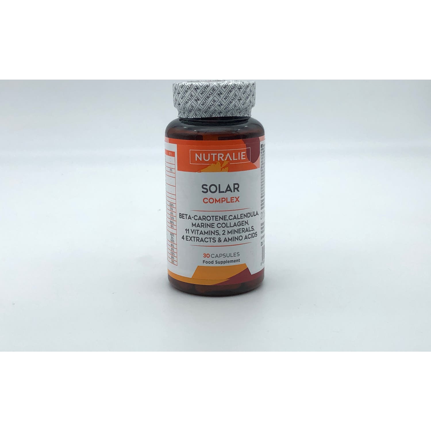 Nutralie Solar Complex con Colágeno Bronceador y Protector 30caps es un complemento alimenticio natural que contribuye a preparar, proteger y acelerar el proceso de bronceado de la piel expuesta al sol.