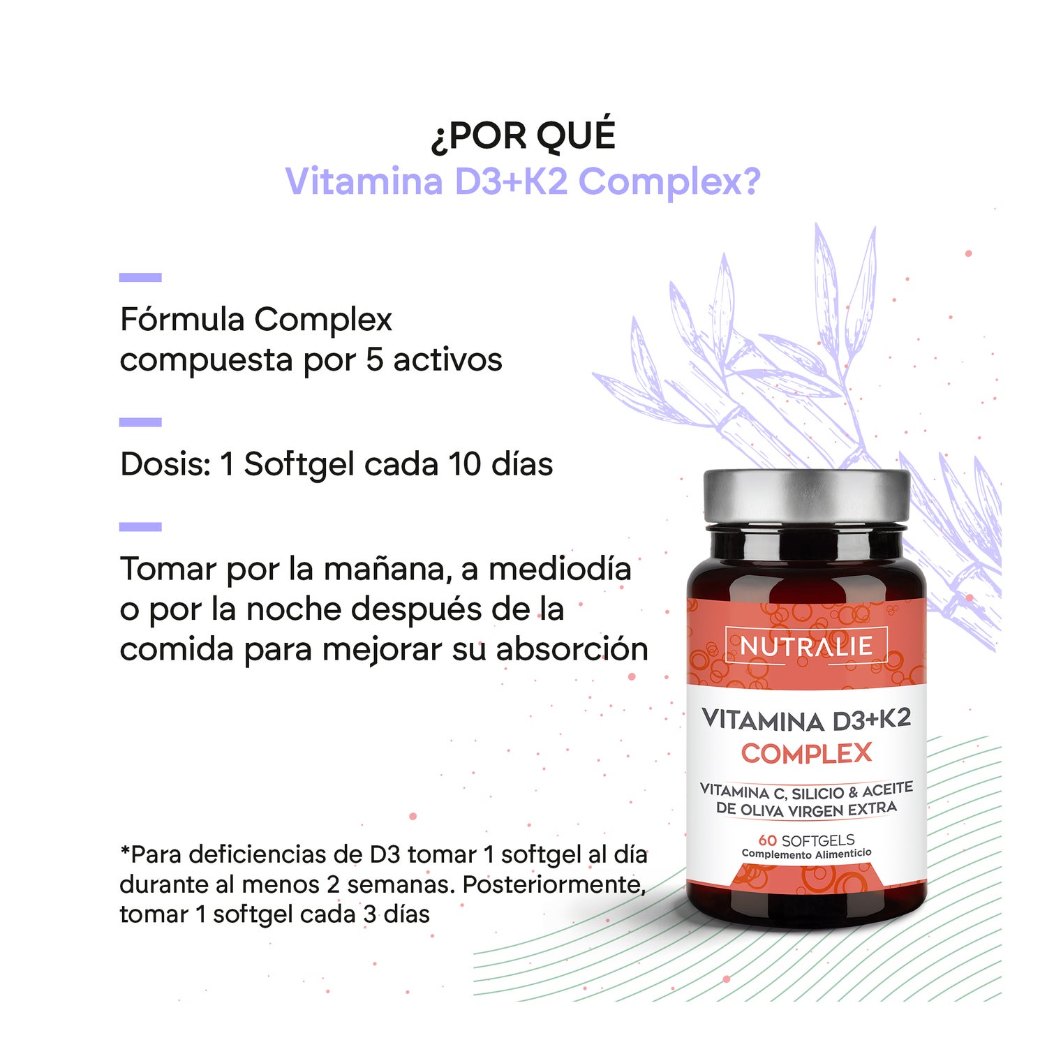 Nutralie Vitamina D3+K2 Complex 10000 UI + Vitamina C 60softgels es un complemento alimenticio formulado con aceite de oliva, vitamina C, vitamina D3 y vitamina K2.