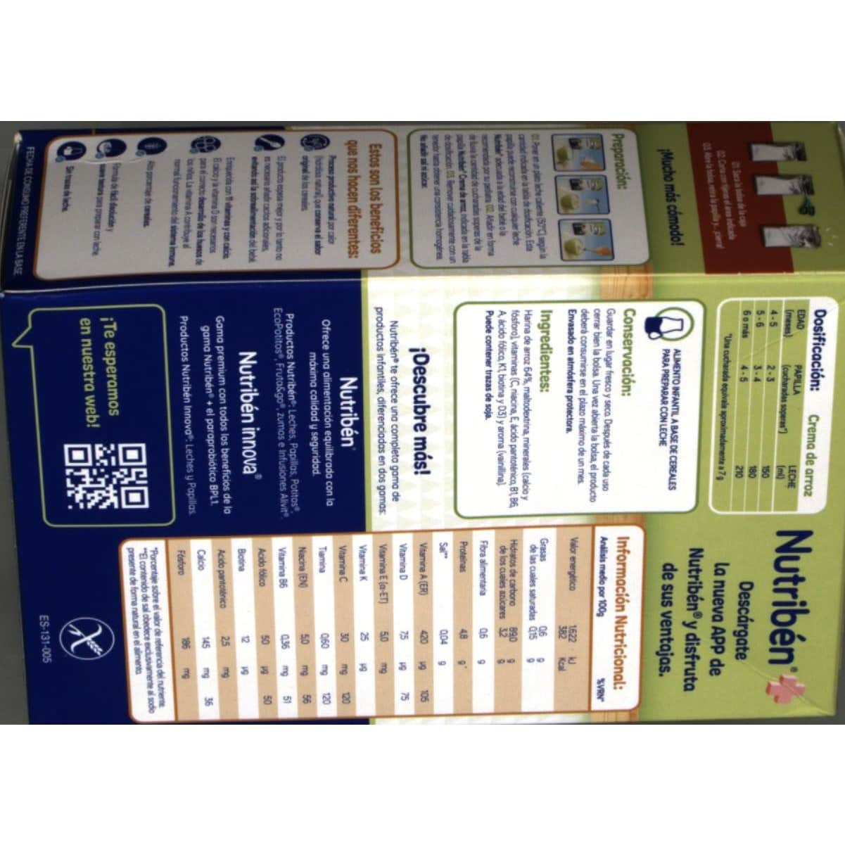 Nutriben crema de arroz es una papilla útil en situaciones de diarrea o gastroenteritis. Elaborada con harina de arroz. Sin azúcares añadidos. Su fórmula está enriquecida con calcio y vitaminas, favoreciendo al crecimiento y el desarrollo de los más pequeños.