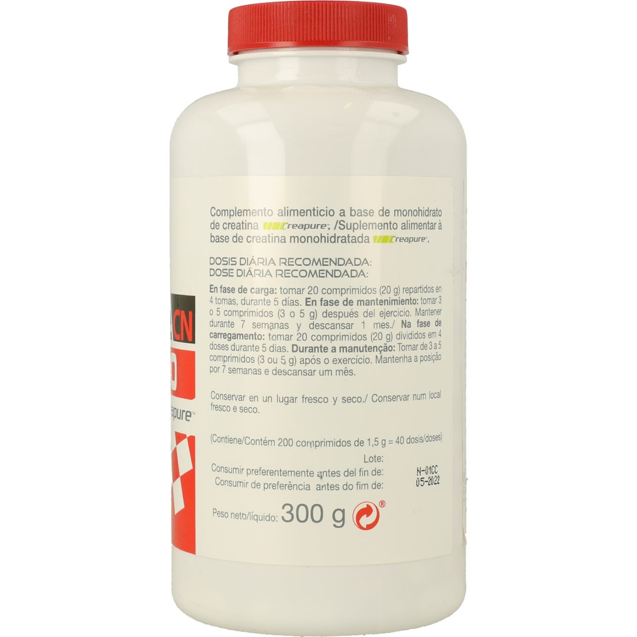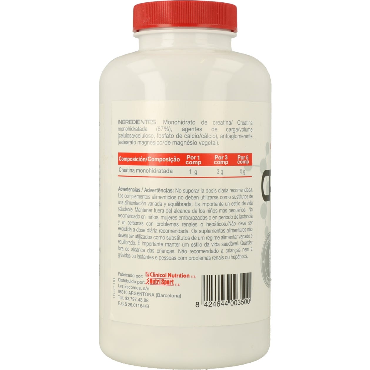 Monohidrato de creatina (67%), agentes de carga (celulosa y fosfato de calcio), antiaglomerante (estearato de magnesio vegetal).