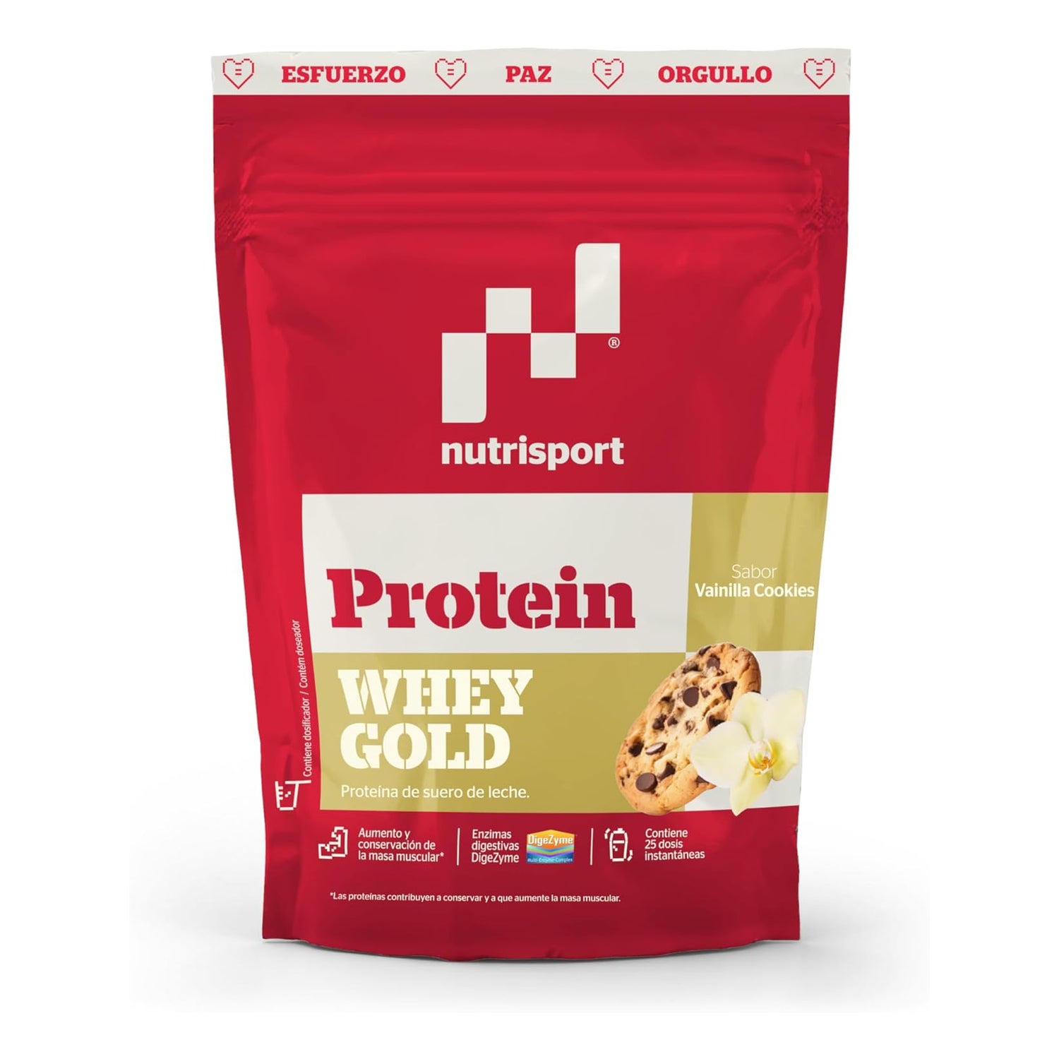 Nutrisport Whey Gold Protein Vainilla Cookie 500 gr es un complemento proteico pensado para deportistas y personas activas que buscan aumentar masa muscular. Incluye concentrado de suero de leche de rápida absorción, orientado a la recuperación post-entreno y al mantenimiento y desarrollo de la masa muscular, con sabor a cookie de vainilla.