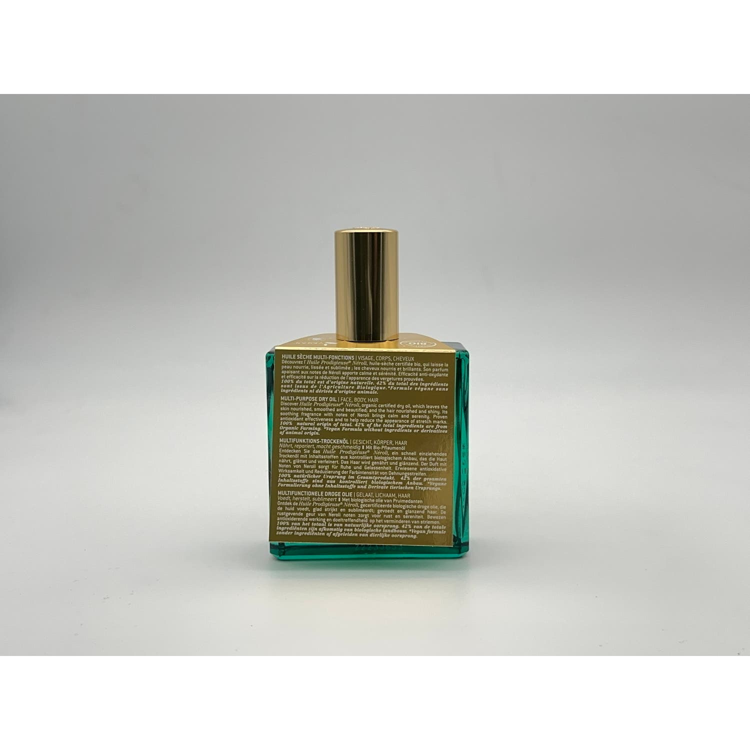 Formulado con un 100% de ingredientes naturales como aceites de Ciruelas de Ente bio y Aceite de Sésamo bio que aporta un acabado seco. Además, posee una fragancia con notas de Nerolí que contribuye a producir una sensación de serenidad.