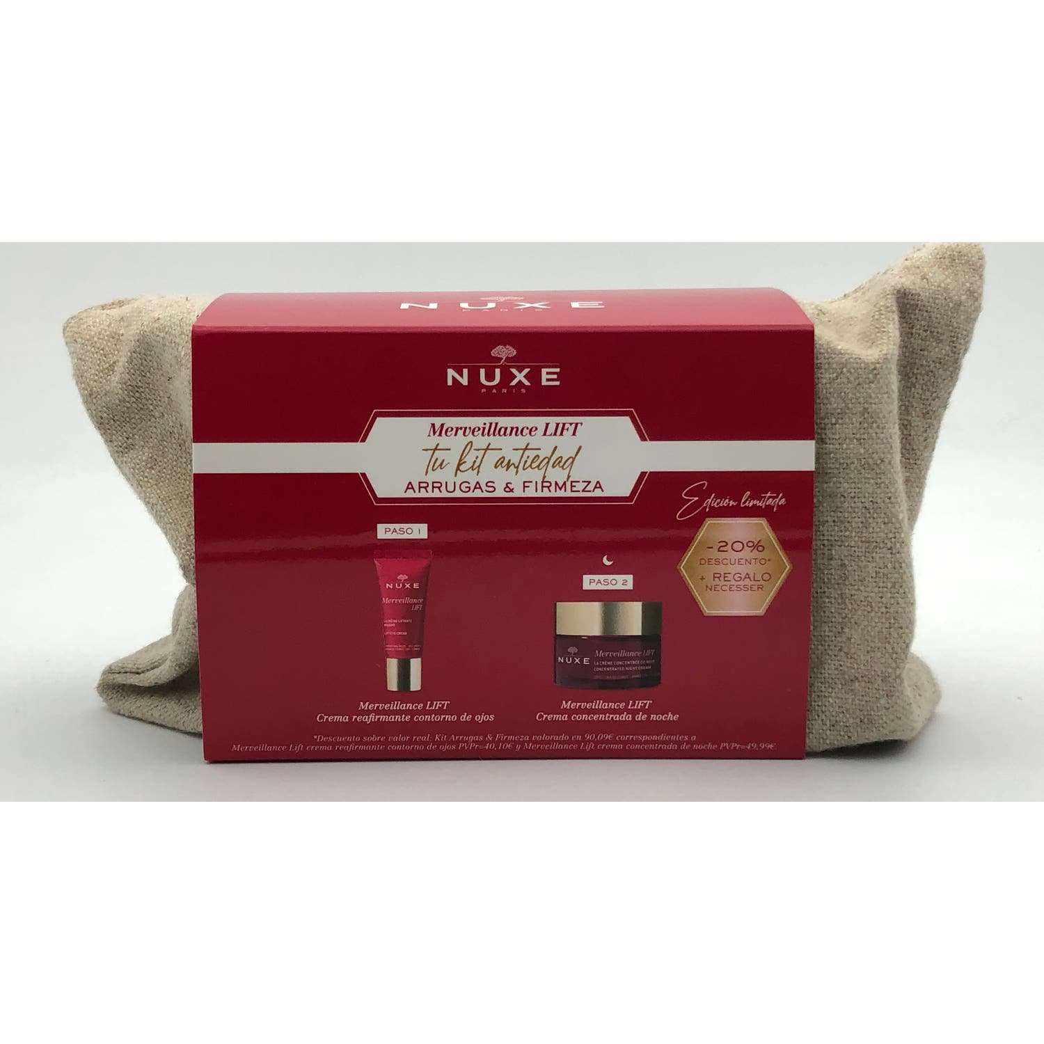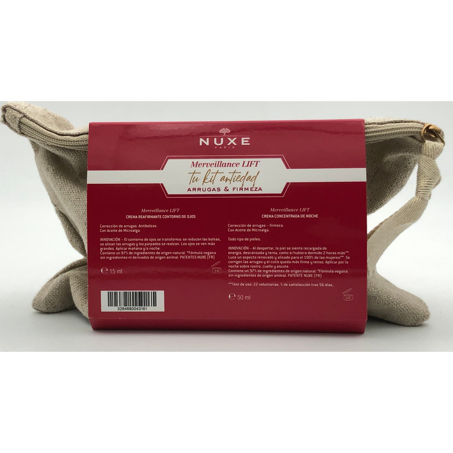 Nuxe Merveillance Lift Kit Antiedad Rutina Noche es un conjunto diseñado para combatir las arrugas y mejorar la firmeza de la piel durante la noche. Este kit incluye dos productos esenciales que forman parte de una rutina de cuidado nocturno.