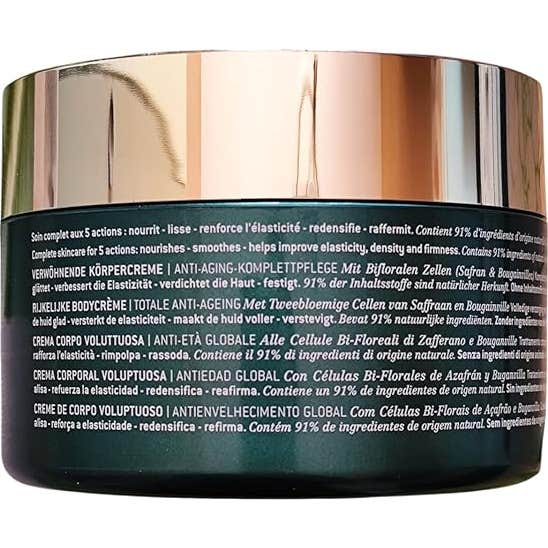 Esta crema corporal antiedad está formulada con células Bi-florales® de Azafrán y Buganvilla, que nutren, alisan, refuerzan y redensifican, dejando un aspecto renovado y terso en todo el cuerpo. Además, de Extracto de Centeno que aporta una acción reafirmante y Manteca de karité nutre con intensidad.