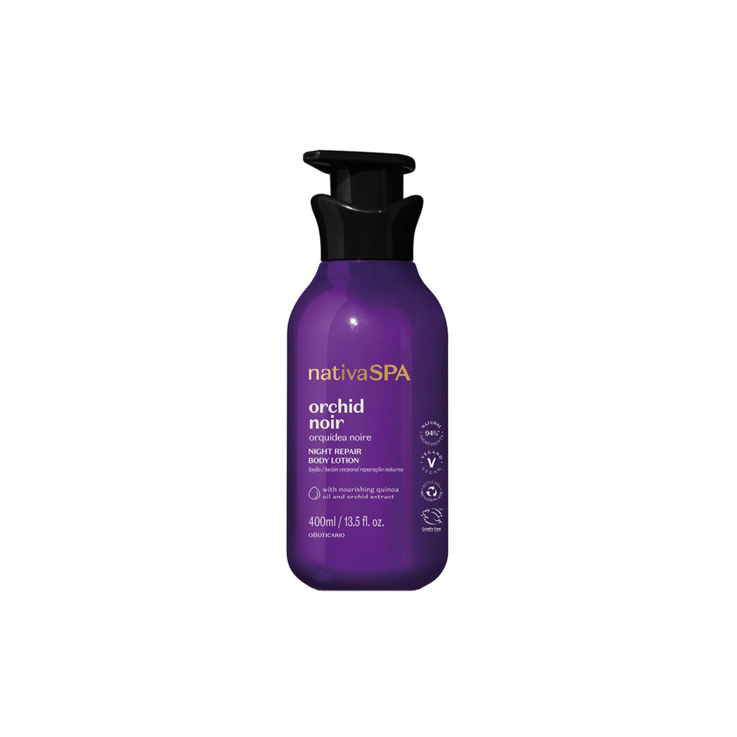O Boticário Nativa SPA Orquídea Noire Loção Corporal 400ml es una loción hidratante diseñada para el cuidado corporal nocturno. Su fórmula es adecuada para todo tipo de piel y es ideal para quienes buscan una piel intensamente hidratada, firme y perfumada con una fragancia floral amaderada, exótica y sensual.