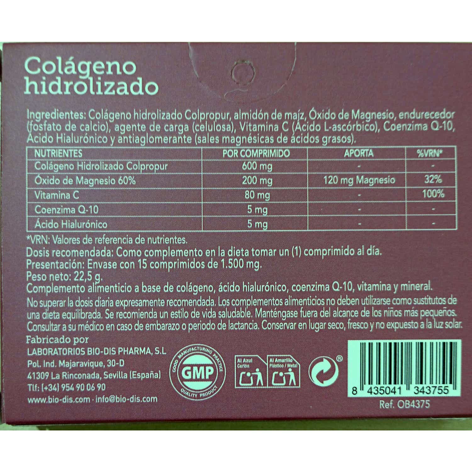 Colágeno hidrolizado Colpropur (600mg), Magnesio (óxido) (120mg), Vitamina C (ácido ascórbico), (80mg) Coenzima Q10 (5mg), Ácido hialurónico (5mg).