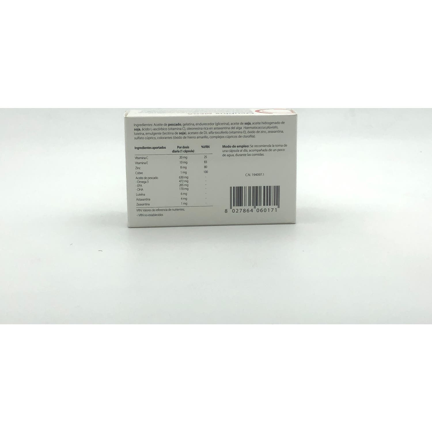 Las cápsulas incluyen vitaminas C y E, zinc, core, carotenoides (astaxantina, luteína y zeaxantina) y ácidos grasos omega 3 (DHA y EPA). Estos componentes son fundamentales para mantener una buena salud visual y proteger las células del daño oxidativo.