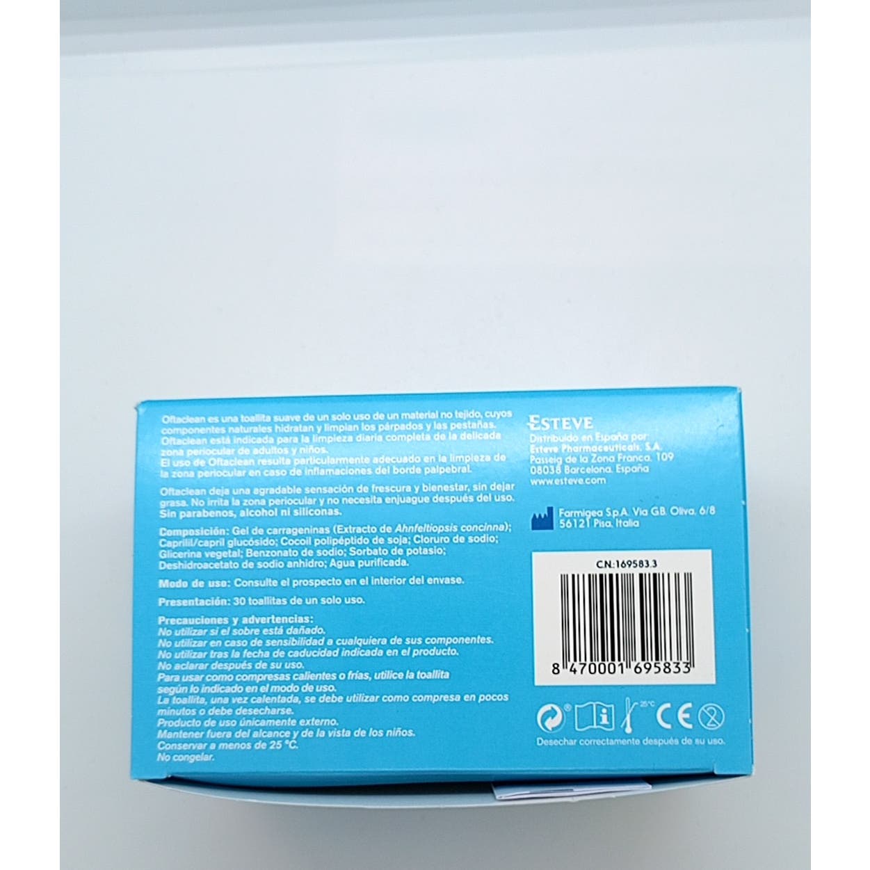 Oftaclean Toallitas Oftálmicas 30uds son toallitas estériles y suaves de un solo uso que ayudan a limpiar los párpados, pestañas y borde palpebral de impurezas o partículas externas que se hayan podido acumular en esta zona a lo largo del día.