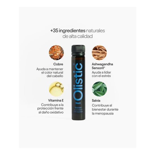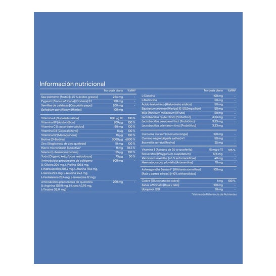 AGUA, HUMECTANTE (GLICERINA), FRUCTOSA DE UVA, AMINOÁCIDOS PRECURSORES DE COLÁGENO (L-GLICINA, L-PROLINA, L-HIDROXIPROLINA, L-ALANINA, L-SERINA, L-LEUCINA, L-FENILALANINA, L-ISOLEUCINA), EXTRACTO DE SAW PALMETTO (SERENOA REPENS, FRUTO), AMINOÁCIDOS PRECURSORES DE QUERATINA (L-ARGININA, L-LISINA Y L-TIROSINA), EXTRACTO DE SEMILLAS DE CALABAZA (CUCURBITA PEPO, SEMILLAS), SUNACTIVE® HIERRO MICRONIZADO (PIROFOSFATO FÉRRICO), AROMAS, CURSOL® EXTRACTO DE CÚRCUMA (CURCUMA LONGA, RIZOMA), SENSORIL® EXTRACTO DE ASHWAGANDHA (WITHANIA SOMNIFERA, RAÍZ), EXTRACTO DE PYGEUM (PRUNUS AFRICANA, CORTEZA), EXTRACTO DE EPILOBIUM (EPILOBIUM PARVIFLORUM, HIERBA), L-CISTEÍNA, EXTRACTO DE SALVIA (SALVIA OFFICINALIS, HOJA Y TALLO), ÁCIDO L-ASCÓRBICO (VITAMINA C), EXTRACTO DE FUCUS VESICULOSUS (0,1 % IODO), ALGA, ESTABILIZANTES (CELULOSA MICROCRISTALINA, SODIO CARBOXIMETILCELULOSA), EXTRACTO DE DUNALIELLA SALINA, ALGA (7,5 % B-CAROTENO), ÁCIDO HIALURÓNICO (HIALURONATO DE SODIO), EXTRACTO DE COLA DE CABALLO (EQUISETUM ARVENSE, HIERBA), EXTRACTO DE COMINO NEGRO (NIGELLA SATIVA, SEMILLAS), EXTRACTO DE MIJO (PANICUM MILIACEUM, SEMILLA), L-METIONINA, ESTABILIZANTE (SUCROÉSTERES DE ÁCIDOS GRASOS), ACIDULANTE (ÁCIDO CÍTRICO), EXTRACTO DE ARÁNDANO AZUL, >5 % ANTOCIANIDINAS (VACCINIUM MYRTILLUS, FRUTO), MENAQUINONA (VITAMINA K2), BISGLICINATO DE ZINC, ACETATO DE DL-ALFA TOCOFERILO (VITAMINA E), EXTRACTO DE BOSWELLIA (BOSWELLIA SERRATA, RESINA), CONSERVADORES (SORBATO DE POTASIO, SODIO BENZOATO), ESPESANTE (GOMA XANTANA), EXTRACTO DE POLYGONUM CUSPIDATUM (98 % RESVERTAROL), L-SELENIOMETIONINA, UBIQUINOL Q10, EXTRACTO DE HAEMATOCOCCUS PLUVIALIS (ASTAXANTINA), GLUCONATO DE COBRE, LACTOBACILLUS PLANTARUM TINDALIZADO, LACTOBACILLUS PARACASEI TINDALIZADO, LACTOBACILLUS REUTERI TINDALIZADO, BIOTINA (D-BIOTINA), EXTRACTO DE CLADONIA RANGIFERINA (COLECALCIFEROL), ÁCIDO FÓLICO (ÁCIDO PTEROILMONOGLUTÁMICO).