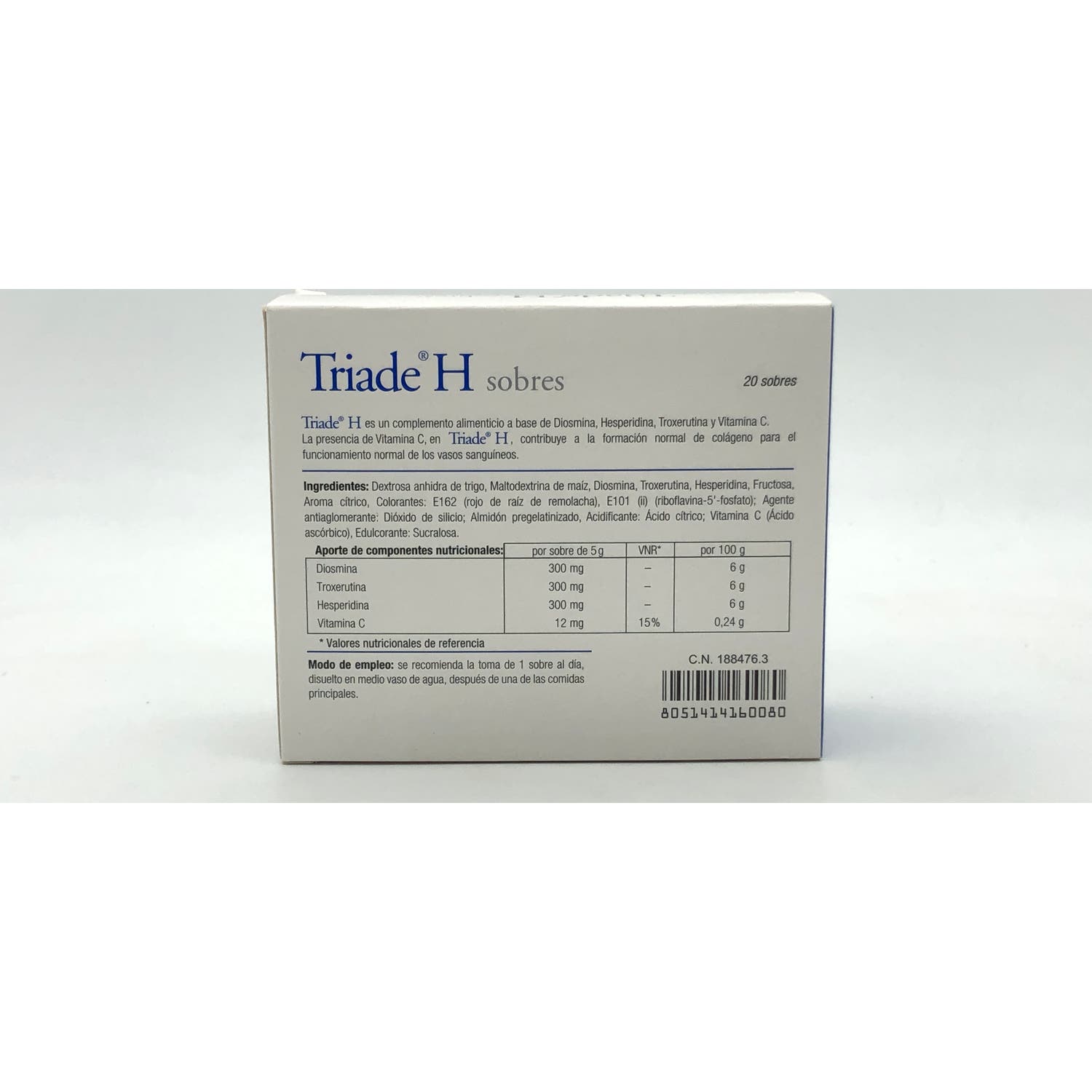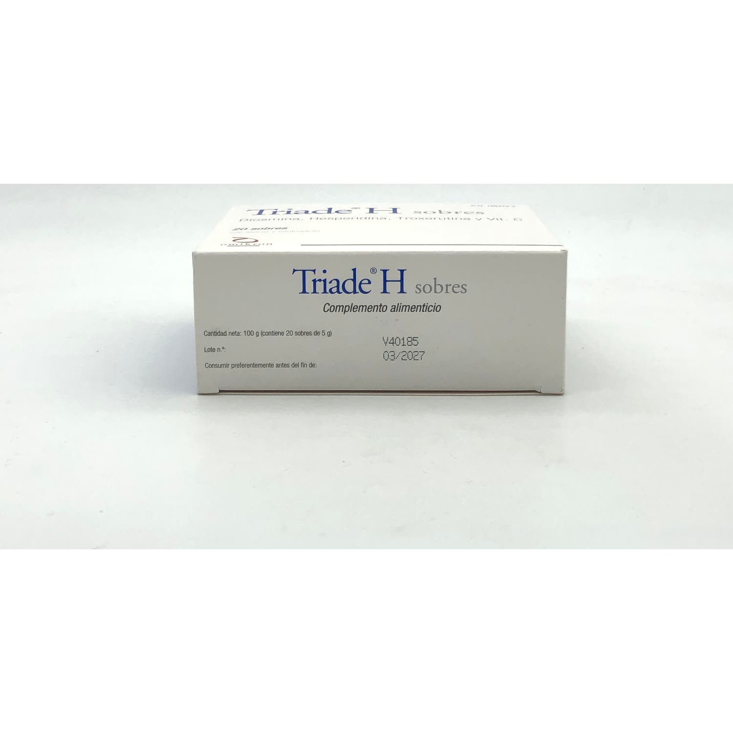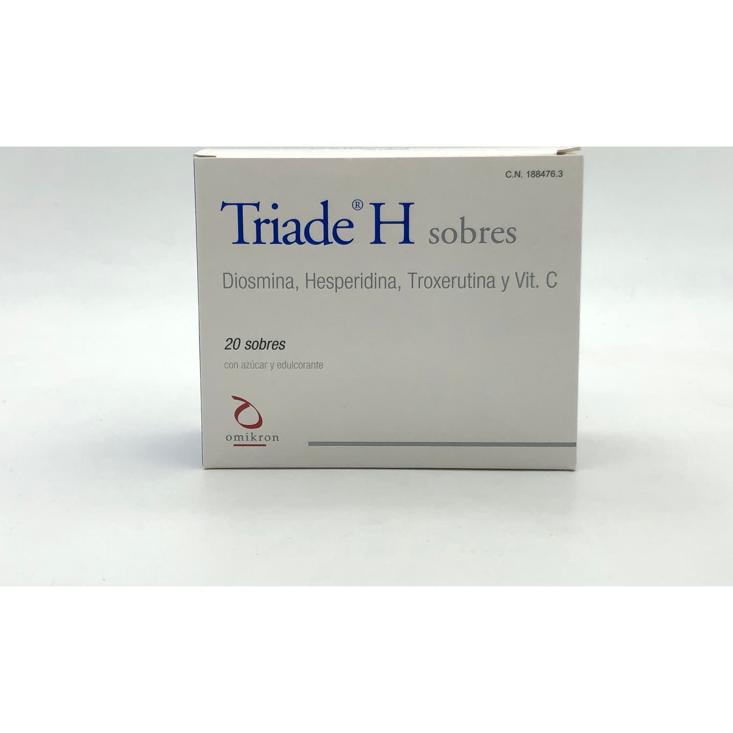 Omikron Triade H 20 Sobres complemento alimenticio formulado a base de diosmina, hesperidina, troxerutina y vitamina c. constituido principalmente por flavonoides que contribuyen al mantenimiento y cuidado de las venas. además, ayuda a la formación normal de colágeno para el normal funcionamiento de los vasos sanguíneos.