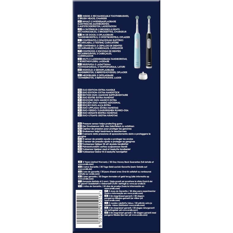 Oral-B Set Pro Serie 1 Duo Cepillo Eléctrico Turquesa + Negro es un pack duplo que incluye dos cepillos eléctricos de la marca Oral-B, la más utilizada por dentistas en todo el mundo. Este cepillo de dientes eléctrico Series 1 te ayuda a cepillarte durante 2 minutos, siguiendo las recomendaciones de tu dentista, gracias a su temporizador profesional que te avisa cada 30 segundos para cambiar la zona que estás cepillando. El cabezal redondo exclusivo de Oral-B elimina hasta un 100 % más de placa que un cepillo manual estándar, promoviendo unas encías más sanas y blanqueando tu sonrisa desde el primer día de uso al eliminar las manchas superficiales. Con 3 modos de limpieza fáciles de usar y un temporizador integrado en el mango, este cepillo es ideal para aquellos que deseen pasarse a un cepillo eléctrico. Además, protege las encías con su tecnología de cabezales redondos inspirada en los cepillos profesionales, y cuenta con un modo de limpieza sensible y control de presión de las encías que detiene automáticamente las pulsaciones del cepillo si se ejerce demasiada presión. Personaliza tu limpieza con los cabezales Oral-B disponibles para la compra según tus necesidades, como limpieza profunda, suave o blanqueamiento. Descubre una mejor limpieza con la marca líder en el sector dental a nivel mundial.