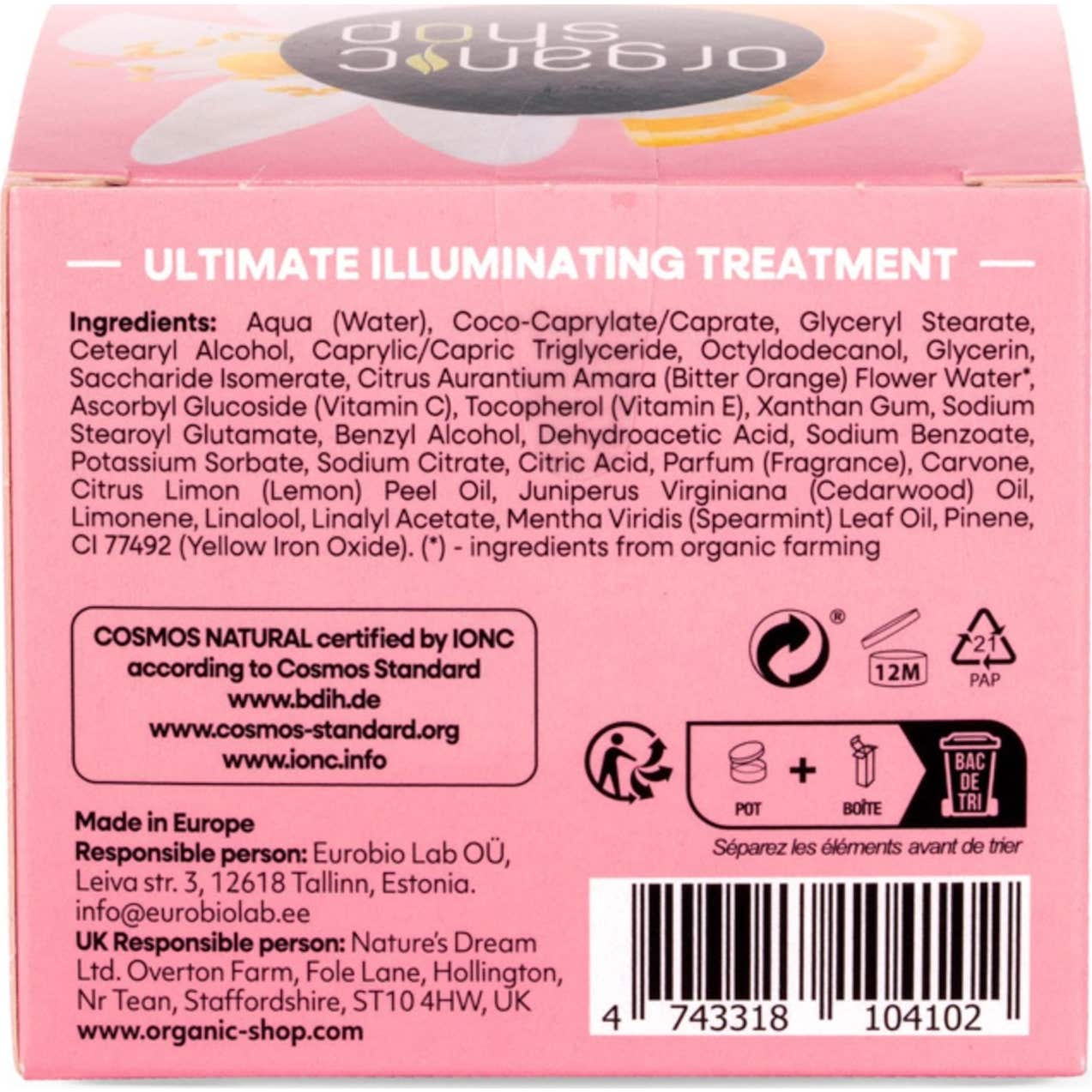 Organic Shop Day Face Cream Ultimate Illuminating Treatment 50ml es una crema de día diseñada para aportar luminosidad a la piel. Su formulación incluye extracto de azahar y vitamina C, ingredientes que ofrecen una hidratación intensa mientras iluminan y protegen la piel.