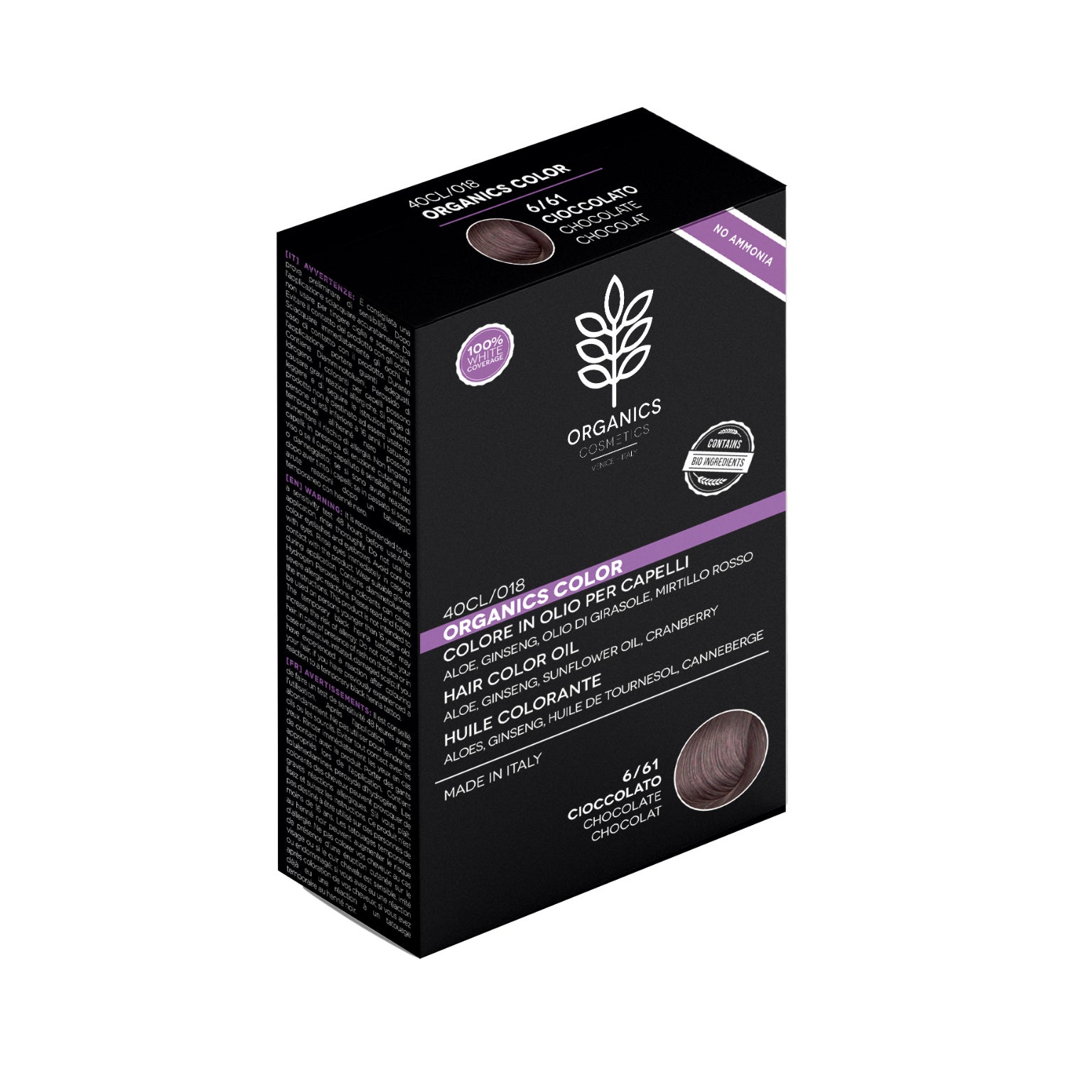 Kit para coloración capilar que incluye un tinte orgánico a base de aceites naturales, un activador de color, un sobre de champú post coloración y un sobre de acondicionador capilar. Ayuda a lucir un cabello de color radiante y revitalizado mientras contribuye a cubrir las canas de forma óptima. La fórmula es de tono chocolate, ideal para crear reflejos cálidos en el pelo. Adecuado para todo tipo de cabello.