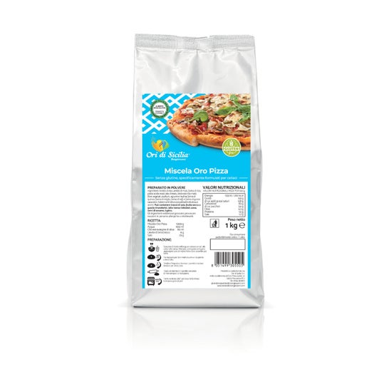 Mezcla para elaborar pizza sin gluten, elaborada con ingredientes naturales procedentes de Sicilia y 100% ecológicos. Es fuente natural de ácidos grasos Omega-3 y 6, en combinación con proteínas y fibras vegetales. Contiene almidón de maíz, arroz, harina de quinoa, garbanzo, fécula de patata, proteína de soja y de guisante. Con un contenido reducido de azúcares, grasas y calorías, que favorecen el cuidado del peso corporal. Ayuda a mantener la energía corporal en niveles óptimos, mientras aporta nutrientes esenciales para el cerebro.