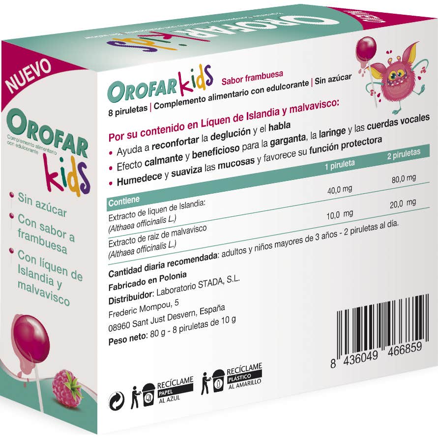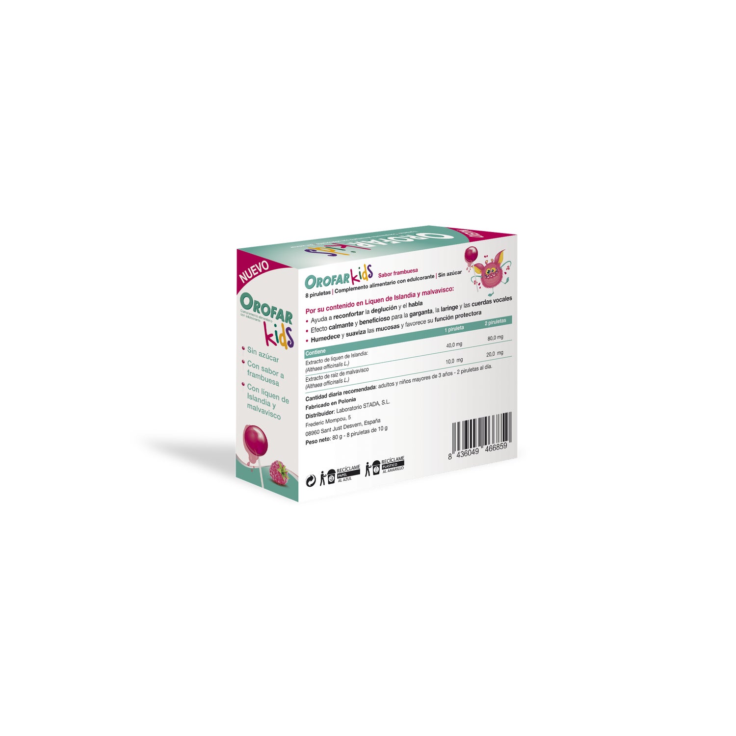 Formato divertido: ¡Ocho piruletas irresistibles que harán que los niños quieran tomarlas! OROFAR Kids ha sido diseñado específicamente para niños y adultos, proporcionando un alivio efectivo para el picor de garganta, la laringe y las cuerdas vocales. Su sabor irresistible a frambuesa y su presentación en forma de piruletas lo convierten en un favorito para los más pequeños.