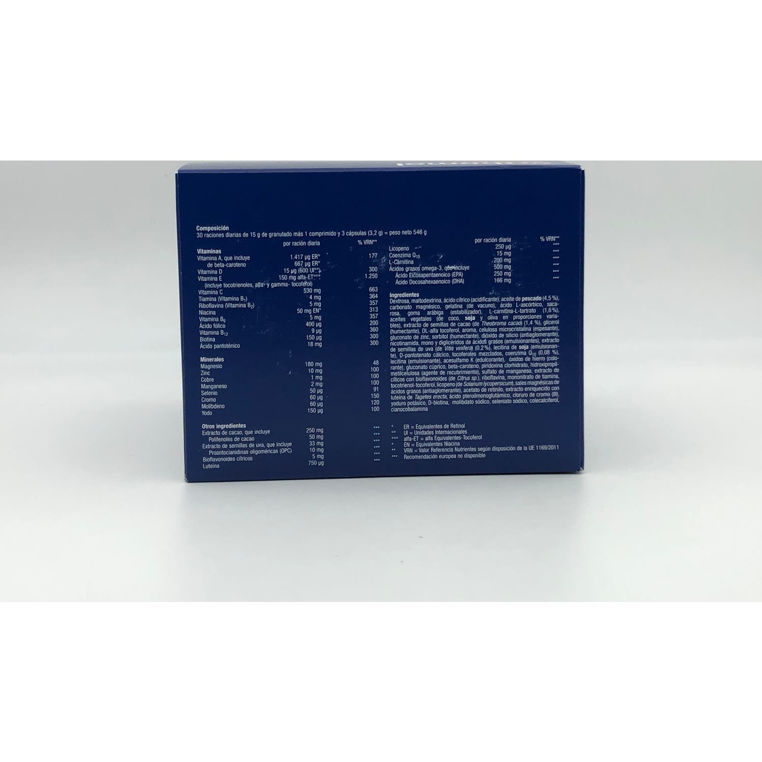 Dextrosa, maltodextrina, ácido cítrico (acidificante), aceite de pescado (4,5 %), carbonato magnésico, gelatina (de vacuno), ácido L-ascórbico, sacarosa, goma arábiga (estabilizador), L-carnitina-L-tartrato (1,6 %), aceites vegetales (de coco, soja y oliva en proporciones variables), extracto de semillas de cacao (de Theobroma cacao) (1,4 %), glicerol (humectante), DL-alfa tocoferol, aroma, celulosa microcristalina (espesante), gluconato de zinc, sorbitol (humectante), dióxido de silicio (antiaglomerante), nicotinamida, mono y diglicéridos de ácidos grasos (emulsionantes), extracto de semillas de uva (de Vitis vinifera) (0,2 %), lecitina de soja (emulsionante), D-pantotenato cálcico, tocoferoles mezclados, coenzima Q10 (0,08 %), lecitina (emulsionante), acesulfamo K (edulcorante), óxidos de hierro (colorante), gluconato cúprico, beta-caroteno, piridoxina clorhidrato, hidroxipropilmetilcelulosa (agente de recubrimiento), sulfato de manganeso, extracto de cíticos con bioflavonoides (de Citrus sp.), riboflavina, mononitrato de tiamina, tocotrienol-tocoferol, licopeno (de Solanum lycopersicum), sales magnésicas de ácidos grasos (antiaglomerante), acetato de retinilo, extracto enriquecido con luteína de Tagetes erecta, ácido pteroilmonoglutámico, cloruro de cromo (III), yoduro potásico, D-biotina, molibdato sódico, seleniato sódico, colecalciferol, cianocobalamina.