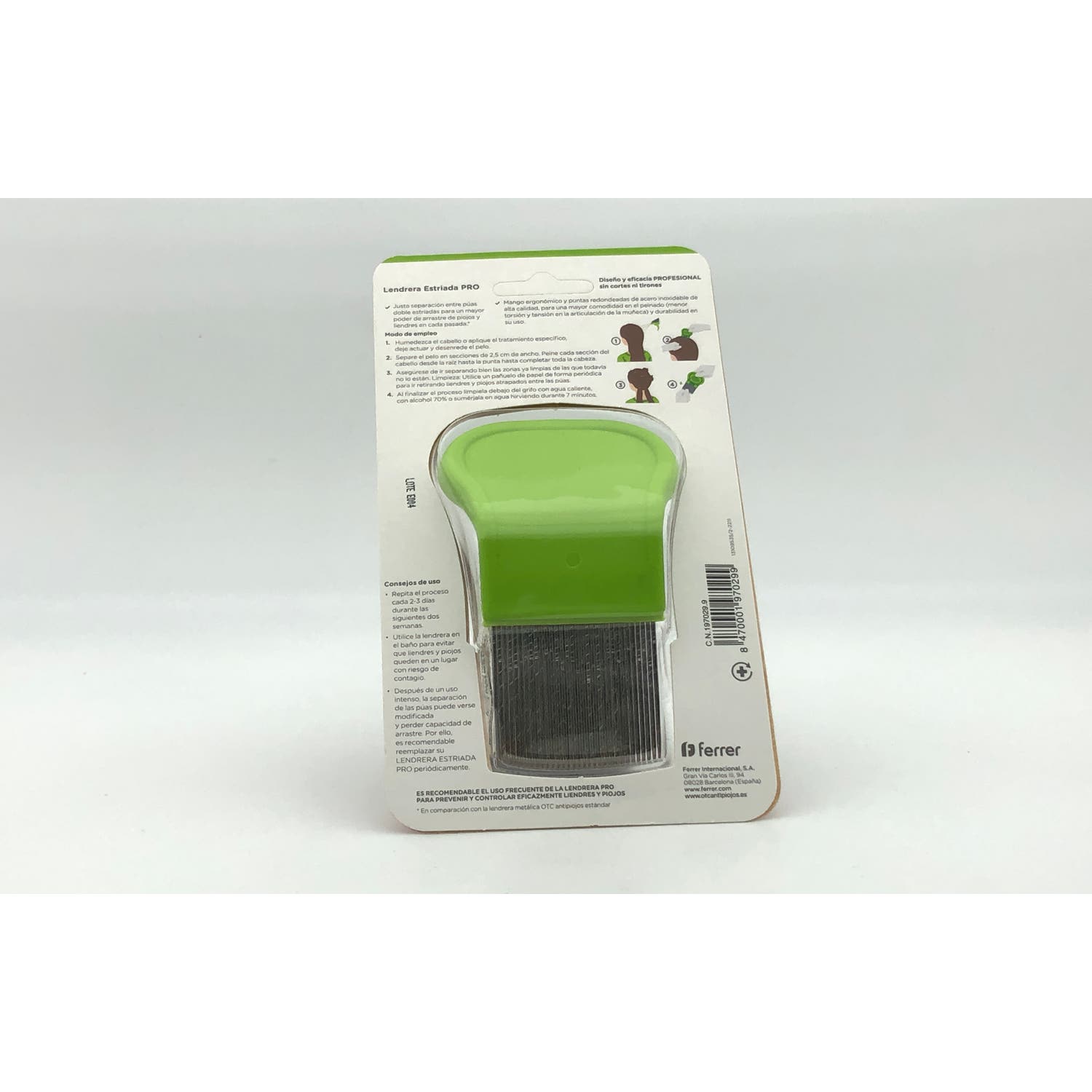 Se trata de una herramienta de púas doble estriadas y estrechas de acero inoxidable, para desprender liendres y piojos en cada pasada. El diseño con mango anatómico y puntas redondeadas permite extraerlos sin tirones y sin necesidad de cortar el pelo.
