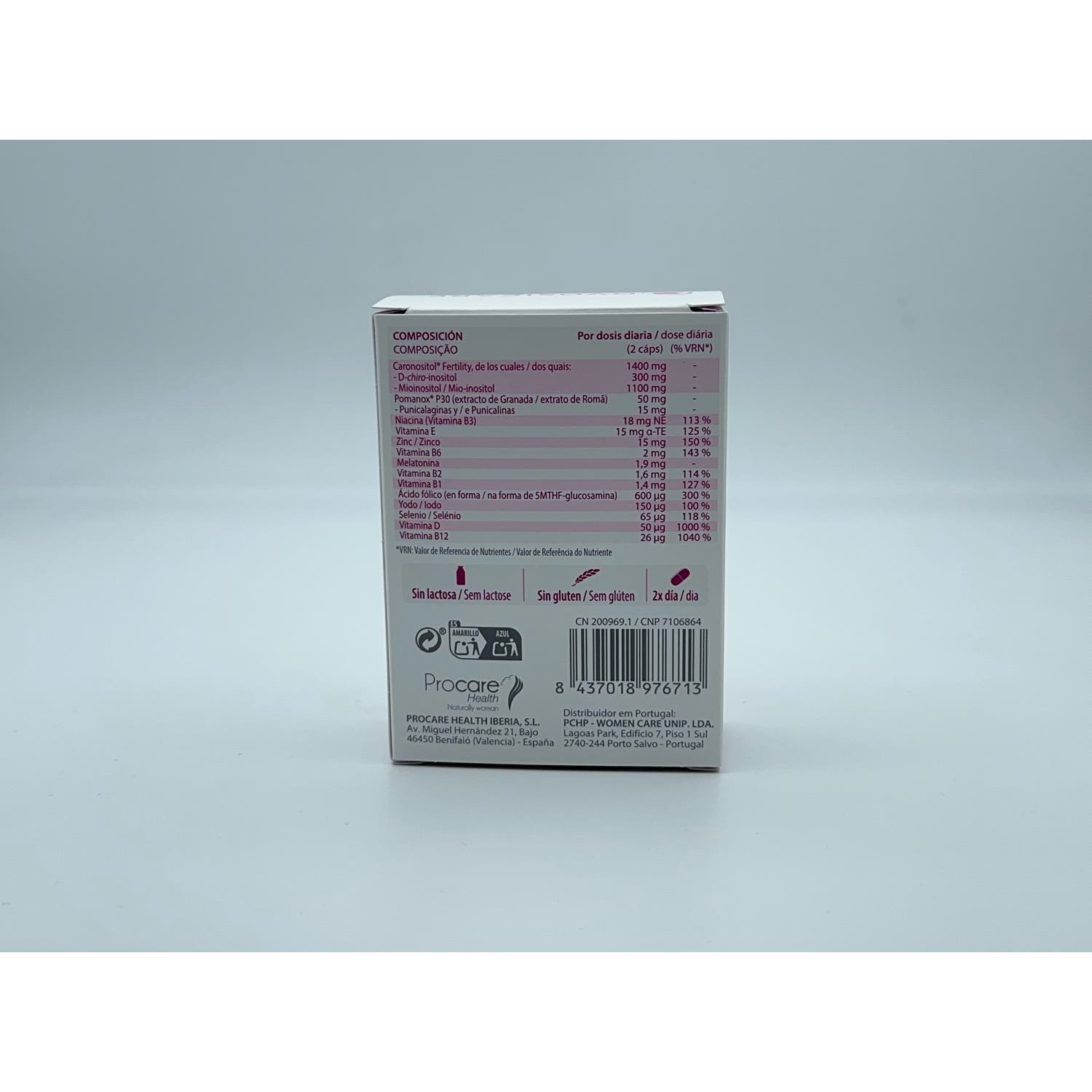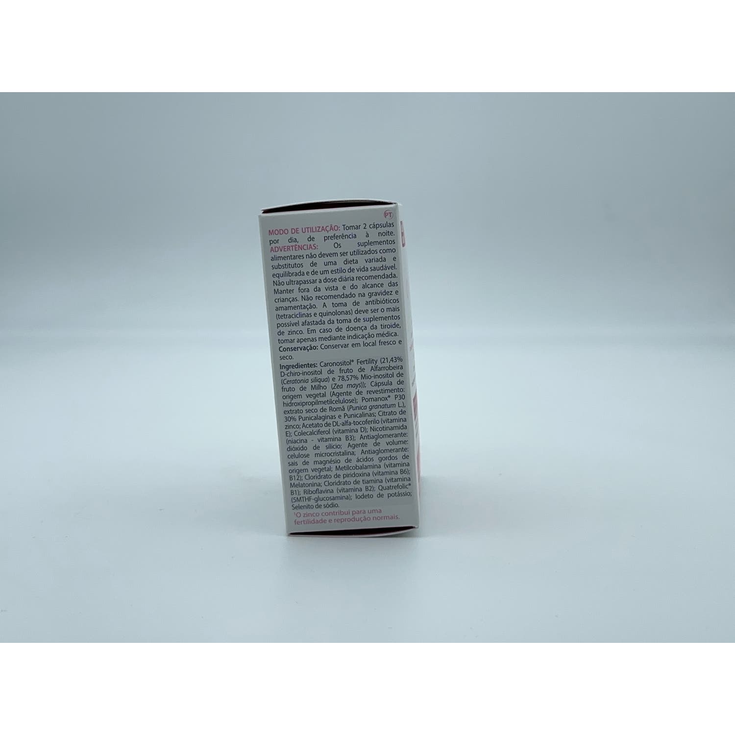 Caronositol® Fertility, de los cuales D Chiro inositol, Mioinositol; Pomanox® P30 (extracto de granada), Punicalaginas, Punicalinas, Ácido pelágico, Vitamina B3, Vitamina E, Zinc, Extracto de Polygonum Cuspidatum de los cuales, Resveratrol, Vitamina B6, Melatonina, Vitamina B2, Vitamina B1, Ácido fólico (Vitamina B9) de los cuales Quatrefolic, Ácido Pteroilmonoglutámico; Yodo, Selenio, Vitamina D3, Vitamina B12.