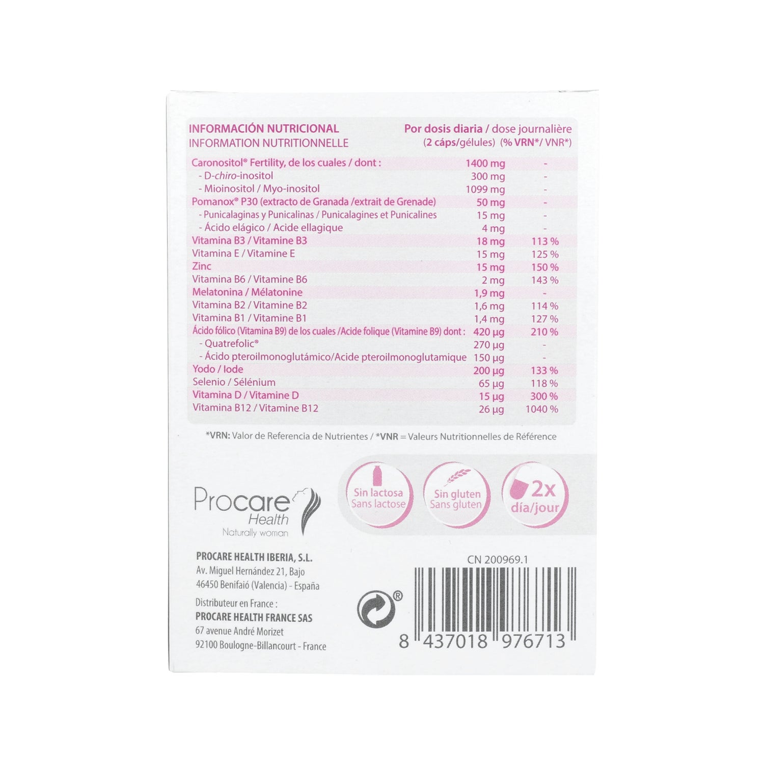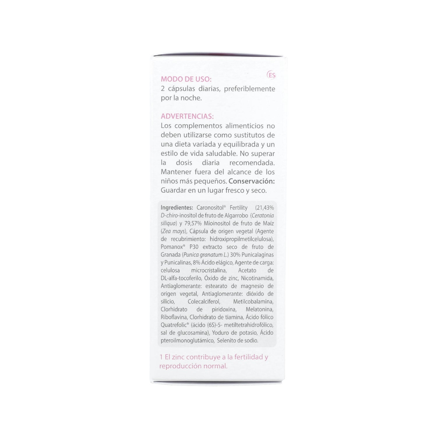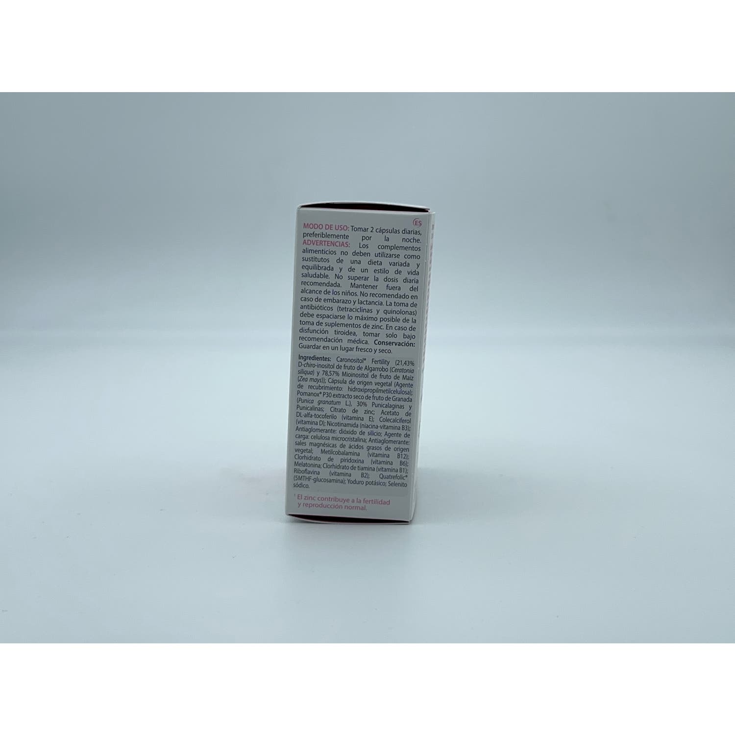 Elaborado a base de Caronositol y Quatrefolic (ácido fólico bioactivo) patentados, extracto de granada, melatonina, vitaminas D, E y grupo B, zinc y otros minerales, que ayudan a mejorar las posibilidades de embarazo a las mujeres en edad fértil.