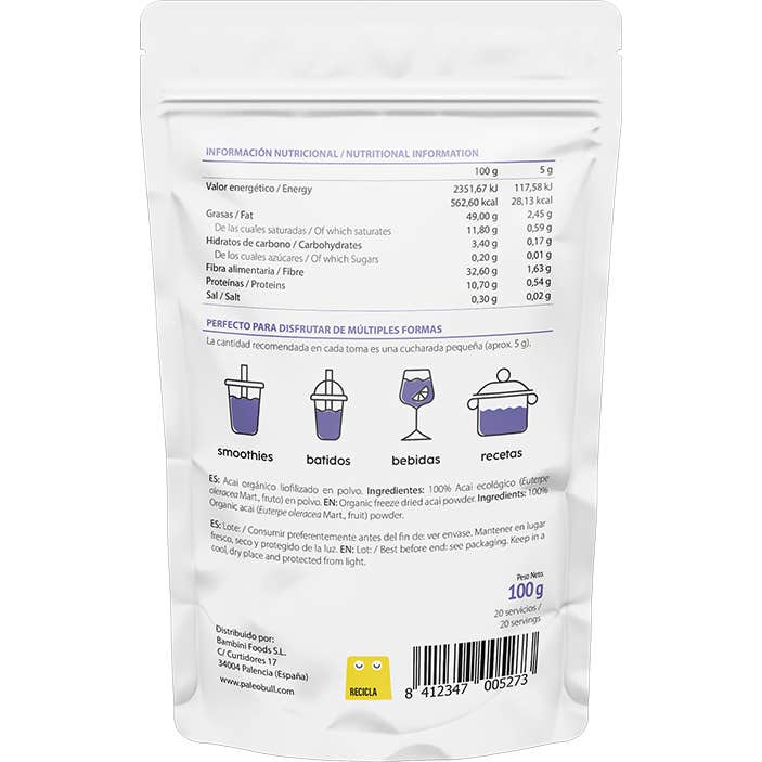 Paleobull Açaí Polvo Eco 100 gr es un polvo liofilizado 100% orgánico elaborado a partir del fruto completo del açaí. Aporta una opción práctica y versátil para incorporar a la rutina diaria de bienestar.