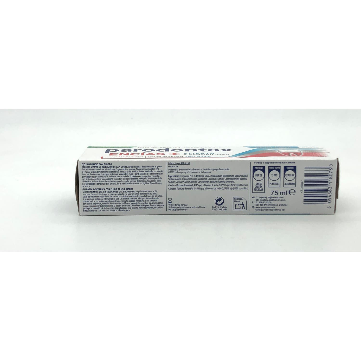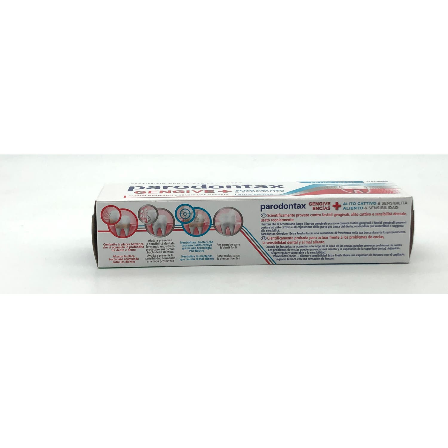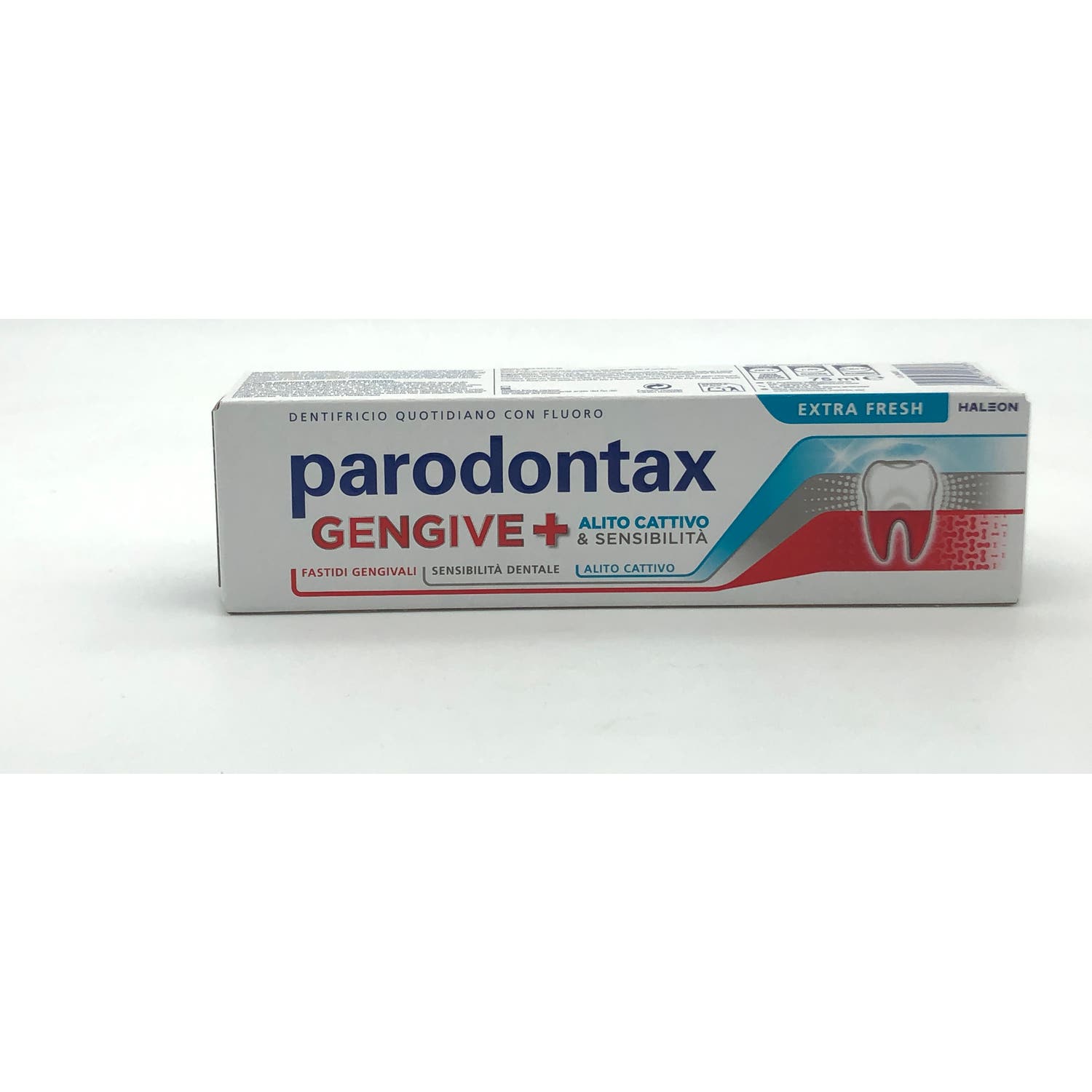 Parodontax Encías + Aliento & Sensibilidad Extra Fresh 75ml es una pasta dentífrica con flúor de uso diario que ayuda a mantener unas encías sanas y dientes fuertes. También ayuda a prevenir la sensibilidad formando una capa protectora y neutraliza las bacterias que causan el mal aliento.